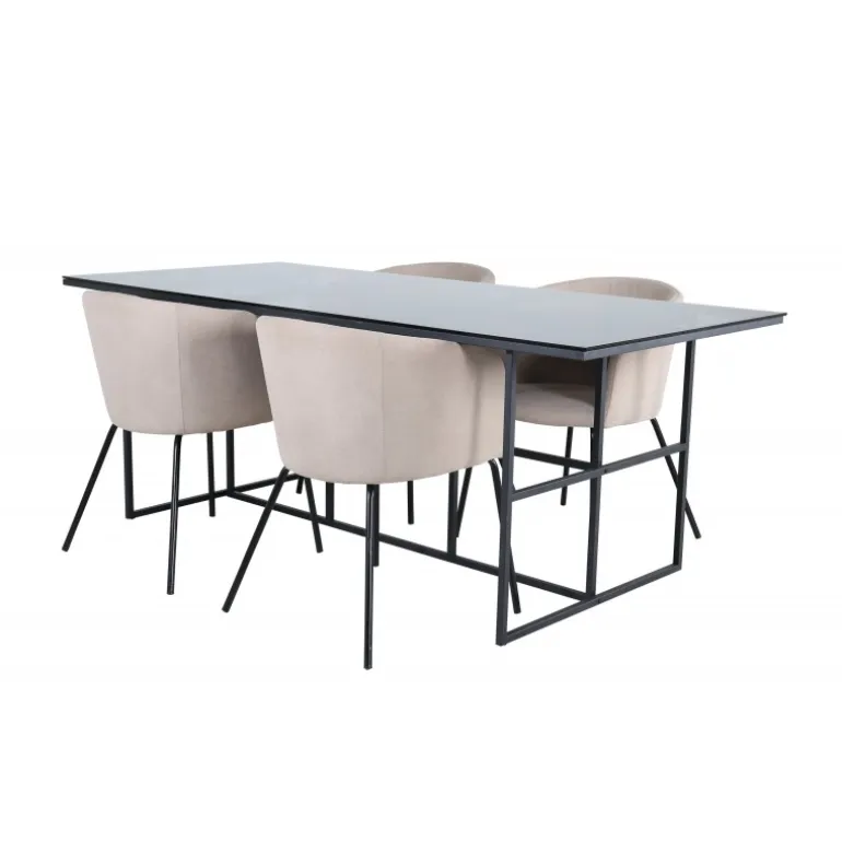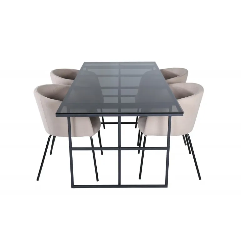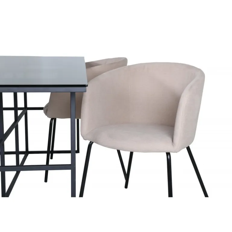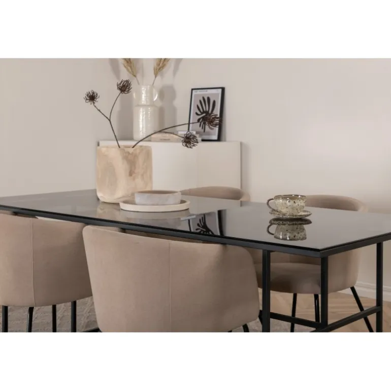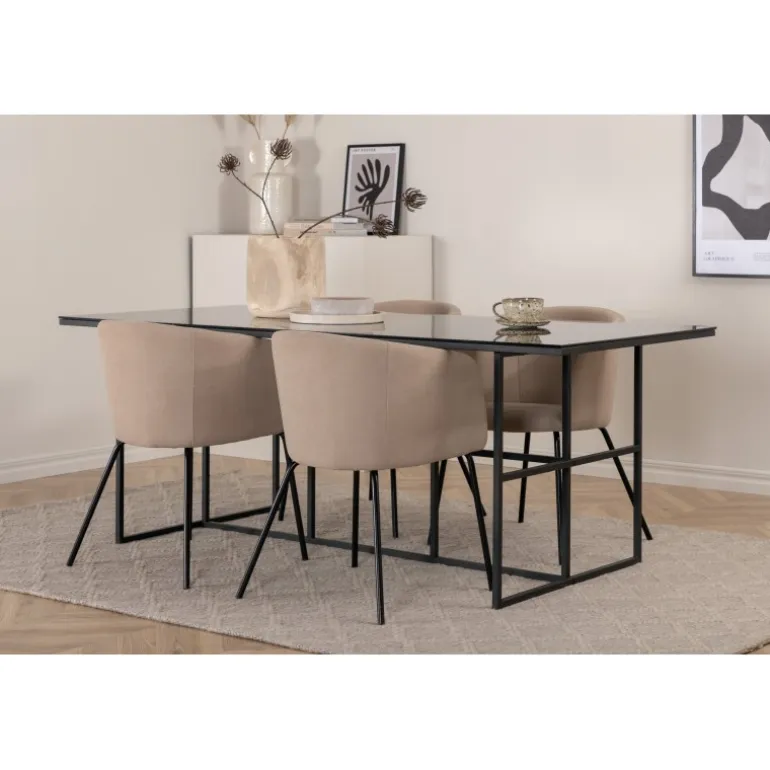 Tag din indretning til næste niveau med et moderne Spisebordssæt i slankt design! Leif spisebord skaber hurtigt et blikfang med sit industrielle look og lige, minimalistiske former. Bordpladen er i røgfarvet sort glas for en stilfuld helhed og stellet af sort metal. Bordets dimensioner: Længde: 200cm, Bredde: 90cm, Højde: 74cm. Her i perfekt kombination med 4 Berit spisestole i beige polyester linned og smalle stoleben i sort jern. Stolens dimensioner: Højde: 78cm, sædehøjde: 49cm, bredde: 55cm, dybde: 55cm. Et Spisebordssæt med fokus på komfort og elegance!