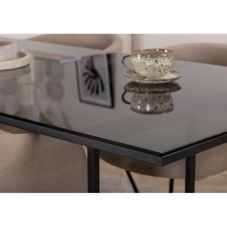 - Stilfuld bordplade: Røgfarvet sort glas, der tilføjer elegance.