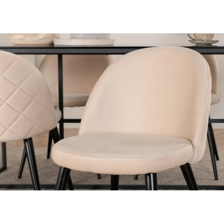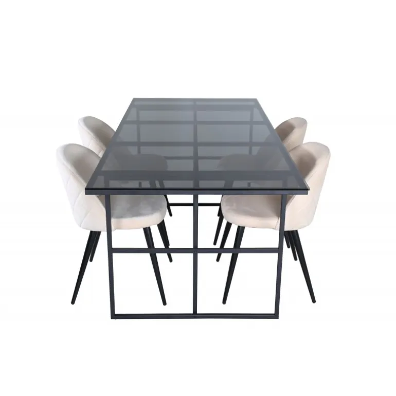 Dekorer stuen moderne og stilfuldt! Spisebordet Leif har et iøjnefaldende design med en elegant topplade i røget sort glas og en ramme i sort metal – inspireret af de industrielle vægge, der klatrer på trendlisterne. Bordmål: Længde: 200 cm, Bredde: 90 cm, Højde: 74 cm. Matcher med 4 Velvet Stitches spisestole med en blød sæde i beige velour med dekorative syninger og sorte stoleben i jern. Stolmål: Højde: 76,5 cm, sædehøjde: 46,5 cm, bredde: 50 cm, dybde: 57 cm. Inviter til mange hyggelige måltider fremover!