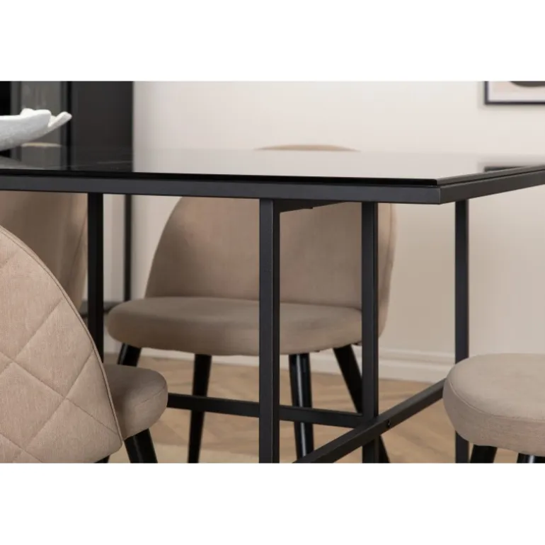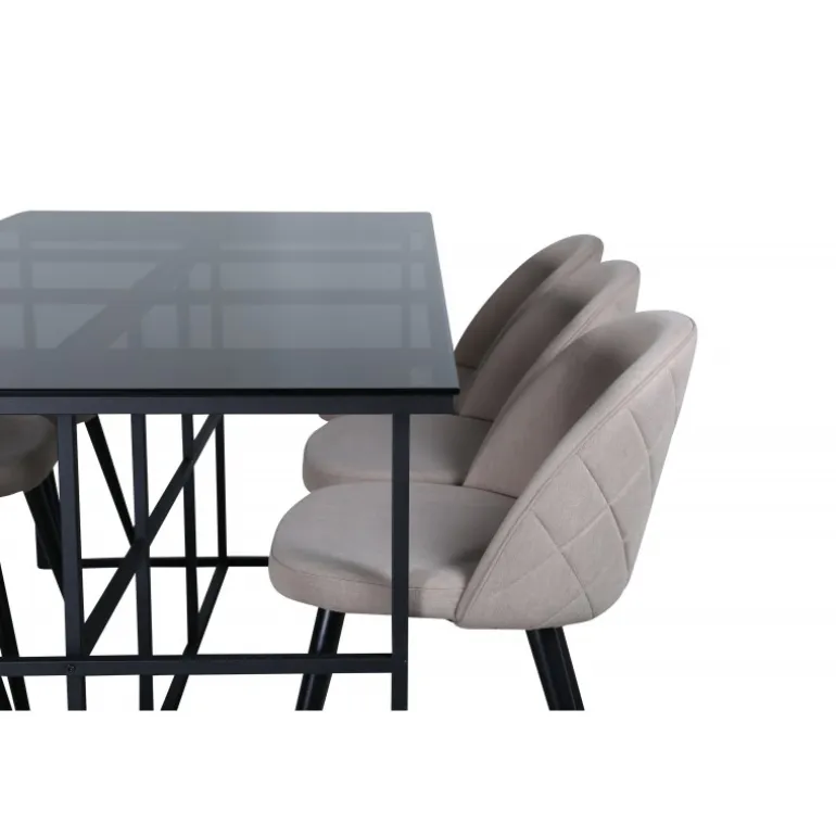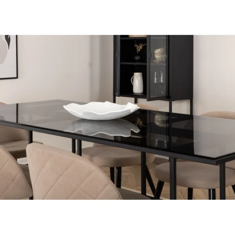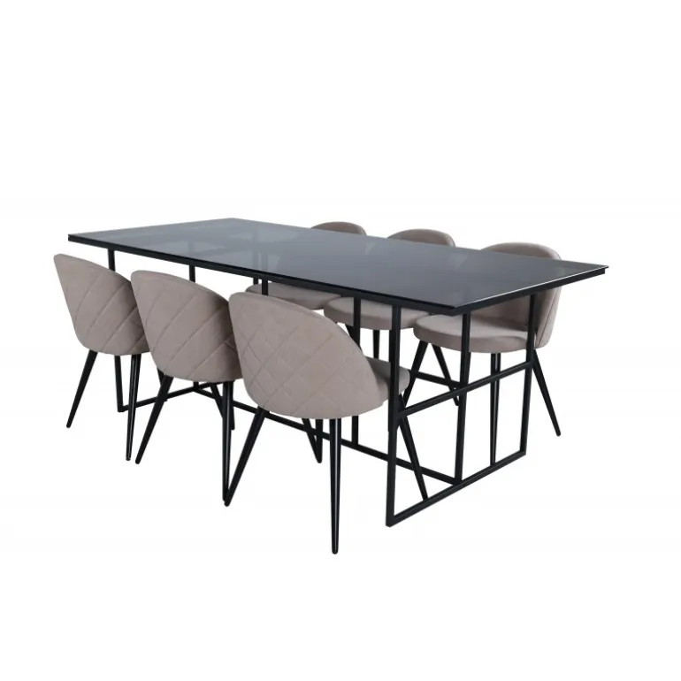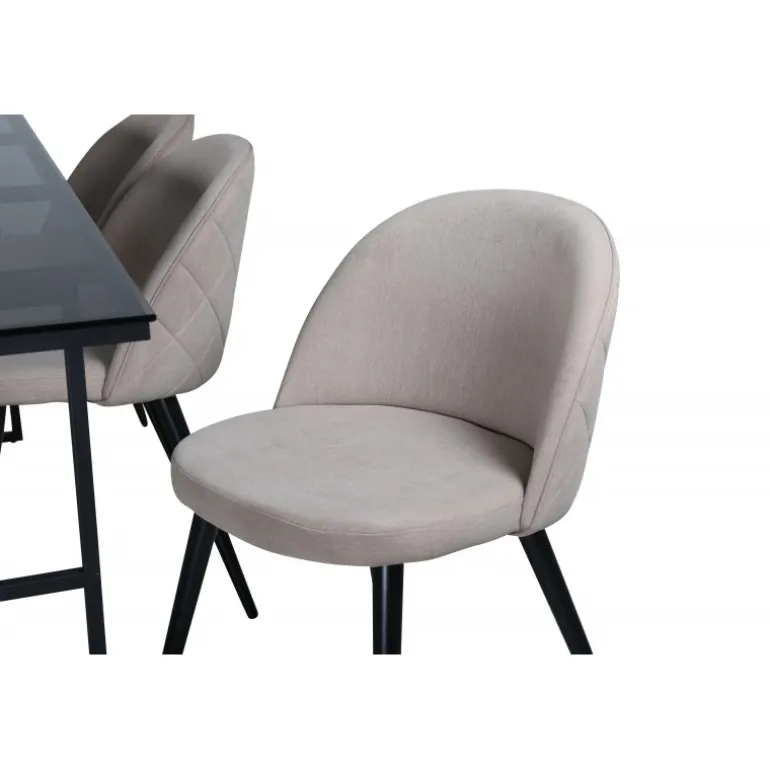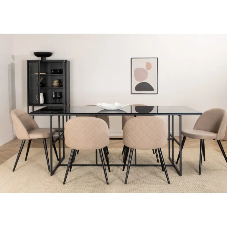 Pynt stuen moderne og stilfuldt! Spisebordet Leif har et iøjnefaldende design med en elegant bordplade i røget sort glas og stel i sort metal – inspireret af de industrielle vægge, der klatrer på trendlisterne. Bordets dimensioner: Længde: 200cm, Bredde: 90cm, Højde: 74cm. Matchet med 6 fløjls-spisestole med dekorative syninger i det beige sæde af polyesterlinned og sorte stoleben i jern. Stolens dimensioner: Højde: 76,5cm, sædehøjde: 46,5cm, bredde: 50cm, dybde: 57cm. Inviter til mange hyggelige måltider fremover!