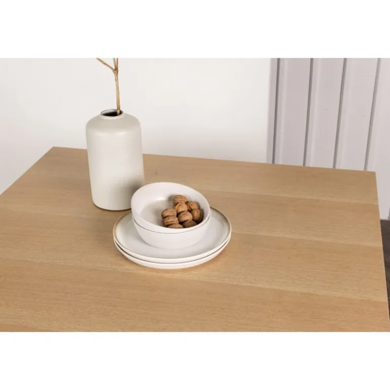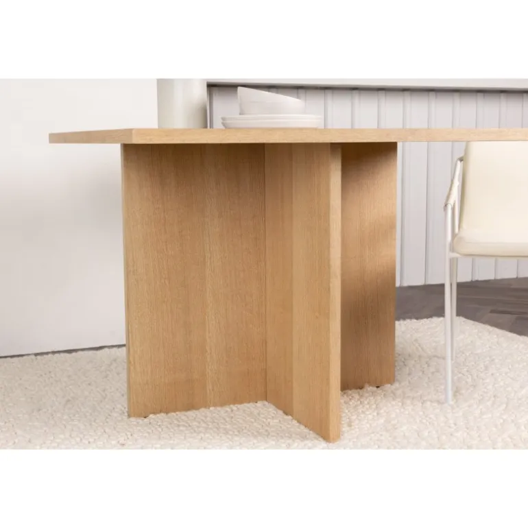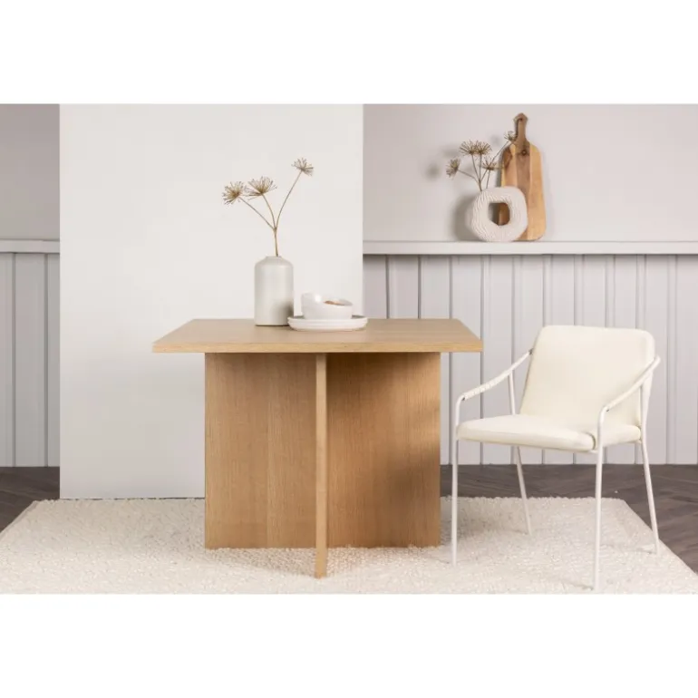 LEO spisebordet er den perfekte kombination af klassisk design og moderne look! Fremstillet i MDF med egetræsfarvet finish, firkantet bordplade og krydsede træplader som ramme. Den kompakte størrelse gør det ideelt selv i mindre køkkener. Nyd skønne måltider omkring dit holdbare og stilfulde spisebord!