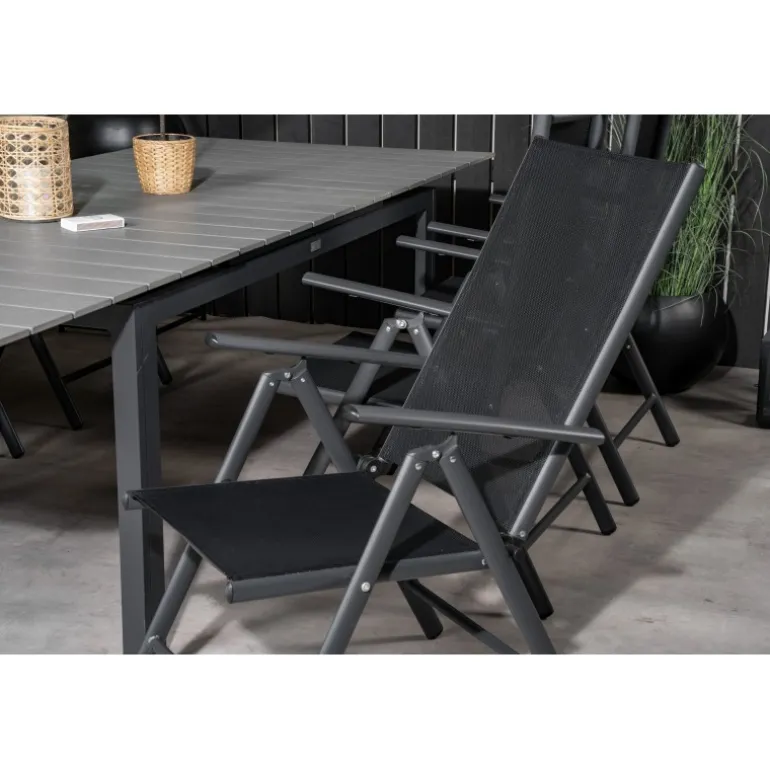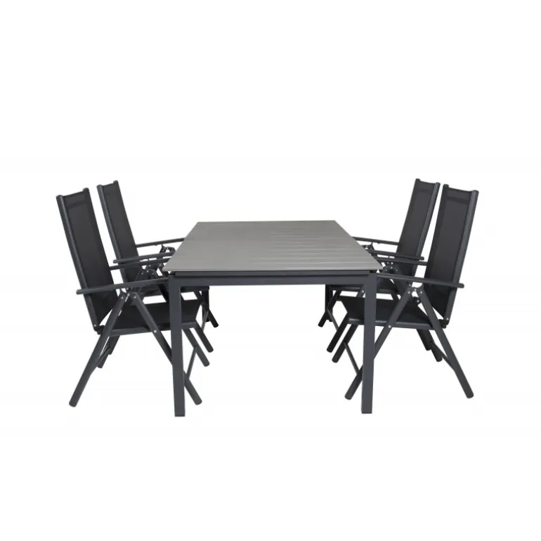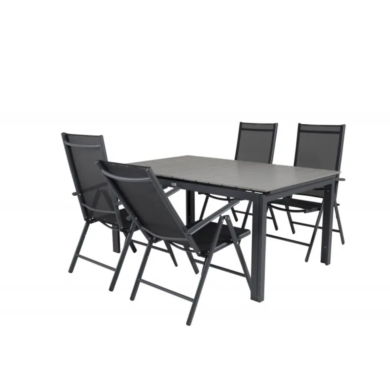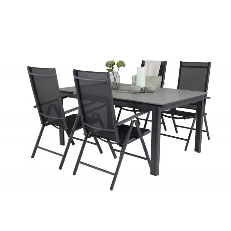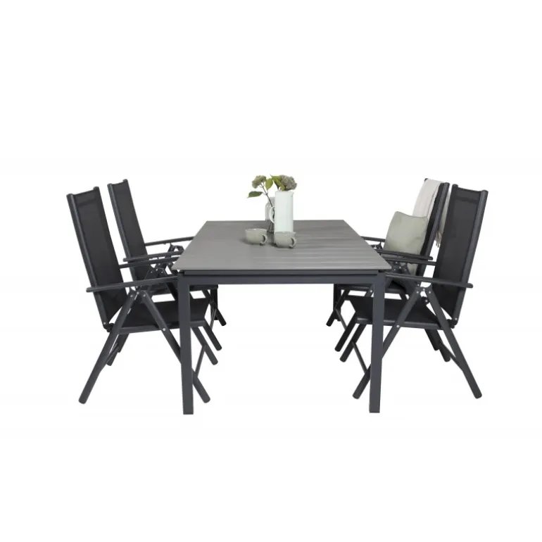 Vores populære foldbare spisestole i Break-serien sammen med spisestuebordet Levels i klassisk stil! Den perfekte kombination for dem, der søger en stilfuld og praktisk Loungesæt – Havemøbelsæt til at dekorere terrassen med. Fremstillet af aintwood, aluminium og textilene, er dette sæt både holdbart og let at vedligeholde. Aintwood-bordpladen kræver særlig pleje for at undgå deformering ved høje temperaturer. Ideelt til udendørs brug med en elegant grå bordplade og sorte stole.