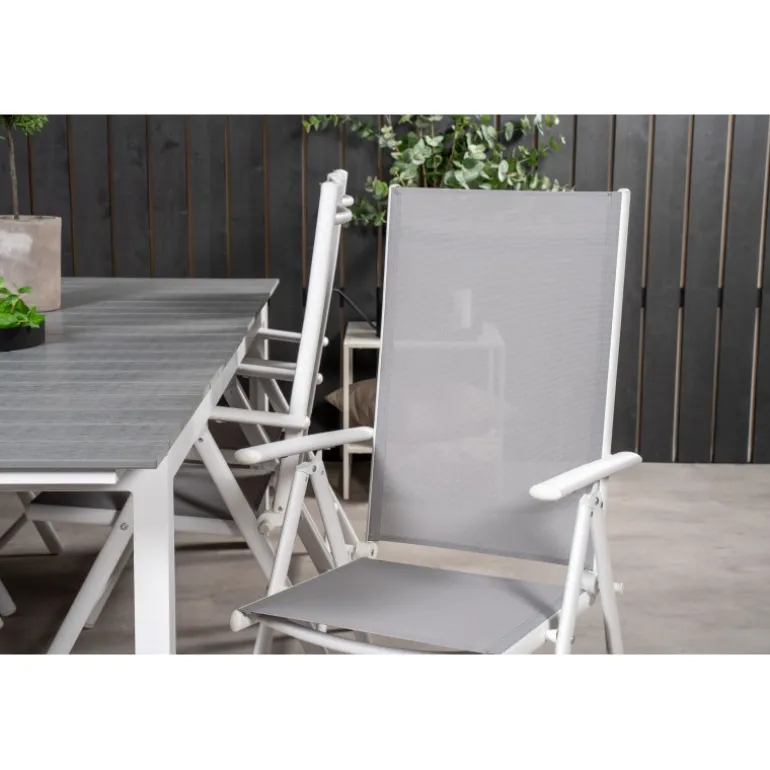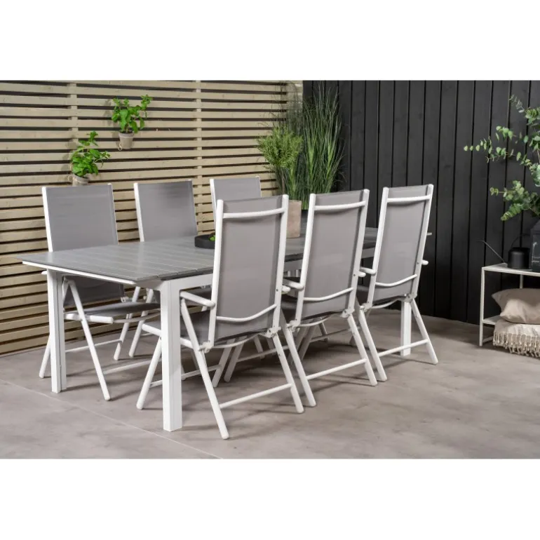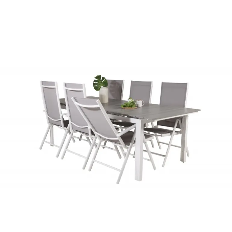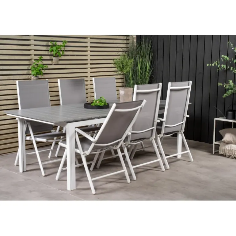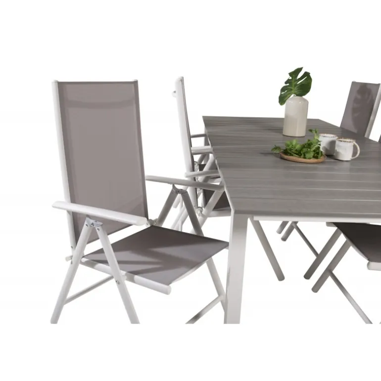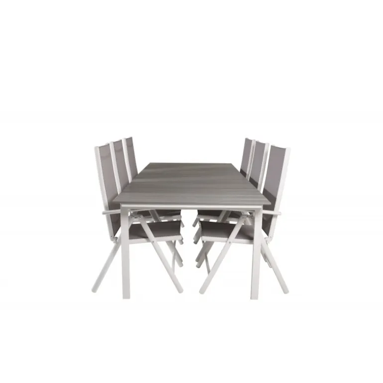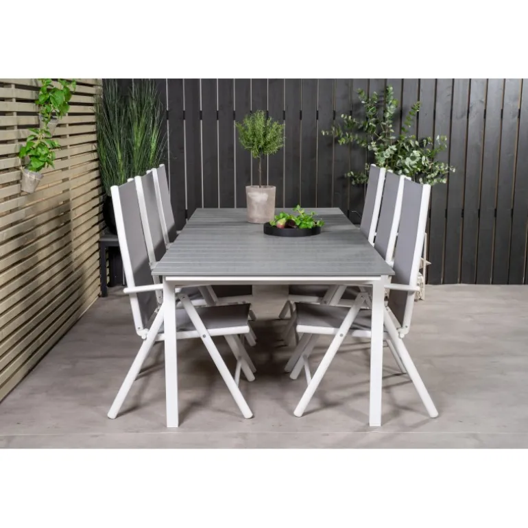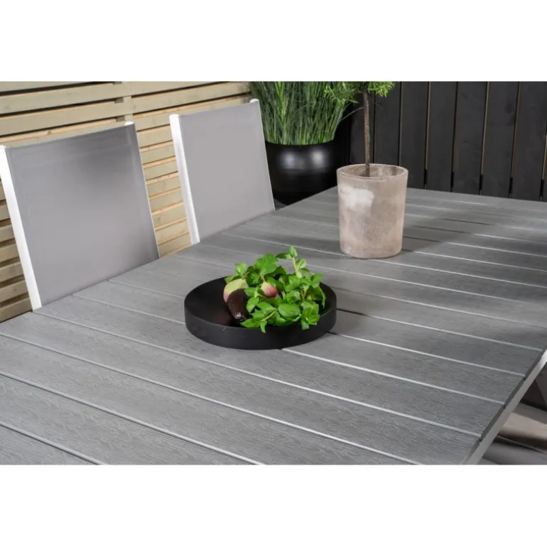 Et madområde i moderne og stilfuldt design. Spisebordet Levels og spisestolene Break er den perfekte kombination til havens hjerte! Dette udendørs Loungesæt – Havemøbelsæt kombinerer ainwood og aluminium for en holdbar og æstetisk appel. Tilgængelig i grå og hvid, dette sæt bringer elegance og funktionalitet til dine udendørs måltider.