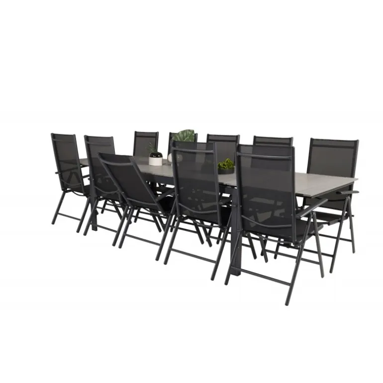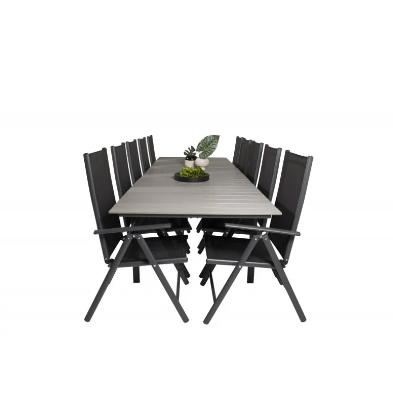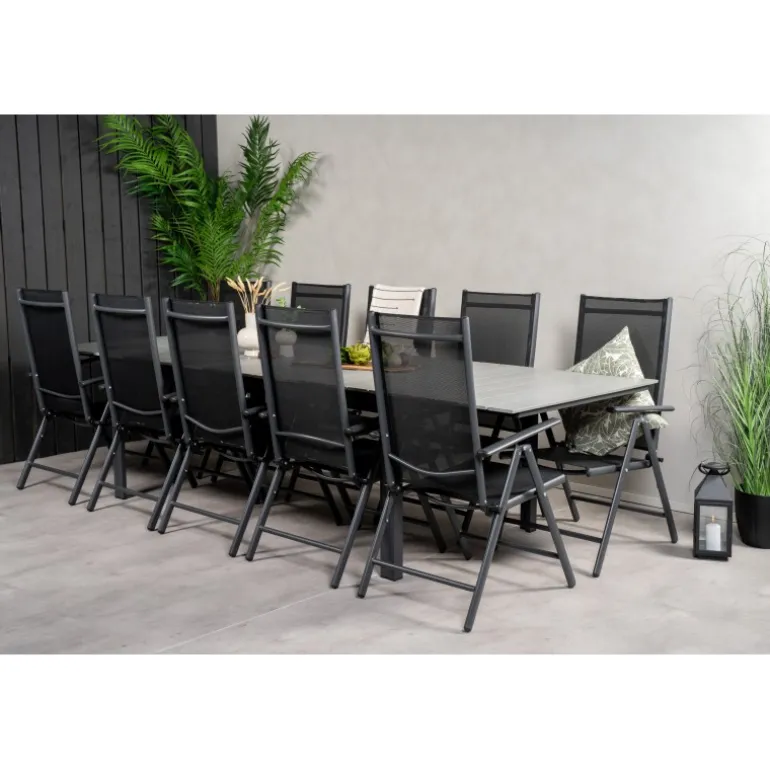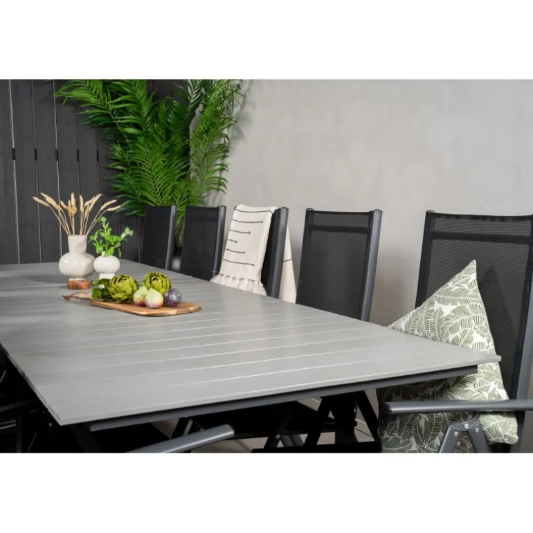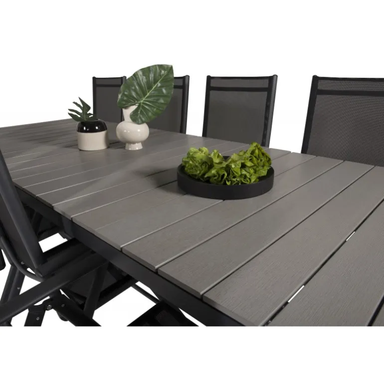 I et konsekvent sort og lige design får du en madgruppe, der holder over tid. Spisebordet Levels sammen med 5-positionsstole i Break-serien. Dette Loungesæt – Havemøbelsæt er ideelt til udendørs brug og kombinerer holdbarhed med stilfuldt design. Materialerne aintwood, aluminium og textilene sikrer, at sættet er modstandsdygtigt over for vejrets påvirkninger, mens den mørkegrå bordplade tilføjer en moderne touch til din udendørs indretning.