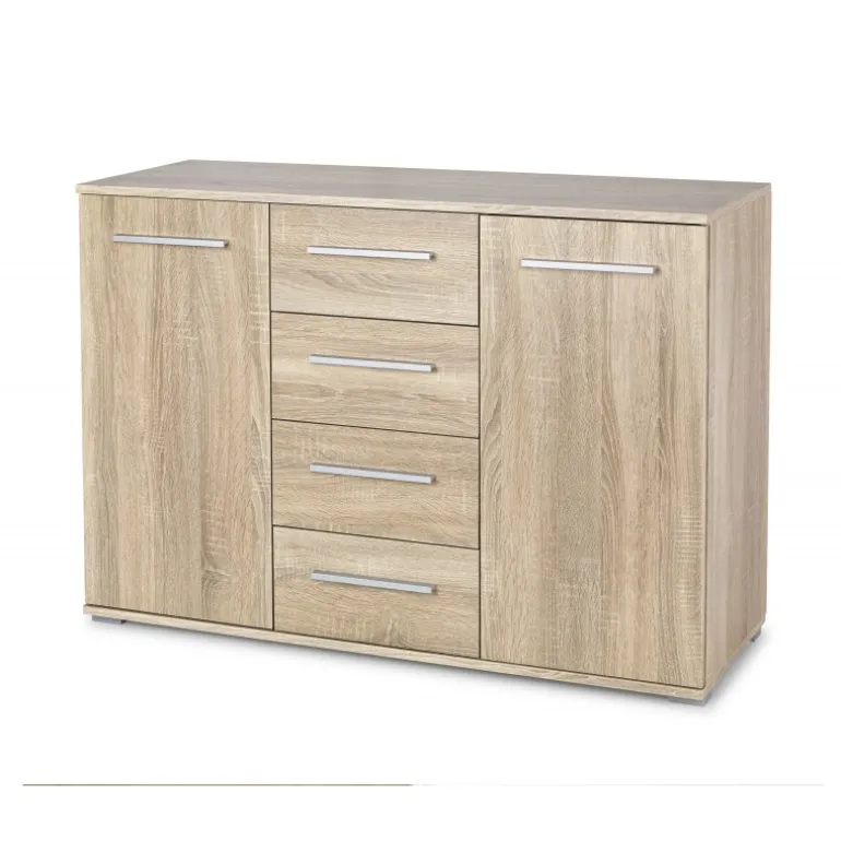 LIMA KM-4 Kommode i sonoma eg er den perfekte løsning til at tilføje både stil og funktionalitet til dit hjem. Denne kommode er fremstillet af lamineret spånplade med ABS plast på kanterne, hvilket sikrer langvarig holdbarhed og en elegant finish. Med dimensionerne 116/40/82 cm passer den perfekt ind i ethvert rum, og dens rummelige skuffer giver masser af opbevaringsplads.