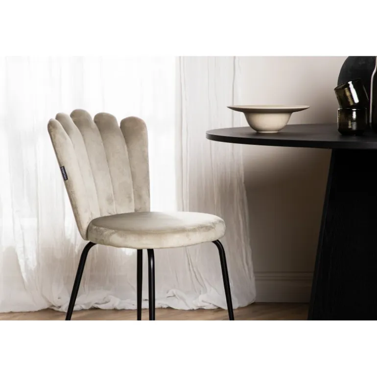 Som stilfuld som tidløs! Limhamn spisebordsstol er en moderne favorit i mange husstande. Den har et indbydende design med en dekorativ, ormformet ryg med dekorative sømme og et rundt sæde i smagfuldt beige fløjlsstof. Benene er i sort pulverlakeret metal. Skab et trendsikkert blikfang i hjemmets hjerte og praktisk rundt om spisebordet!