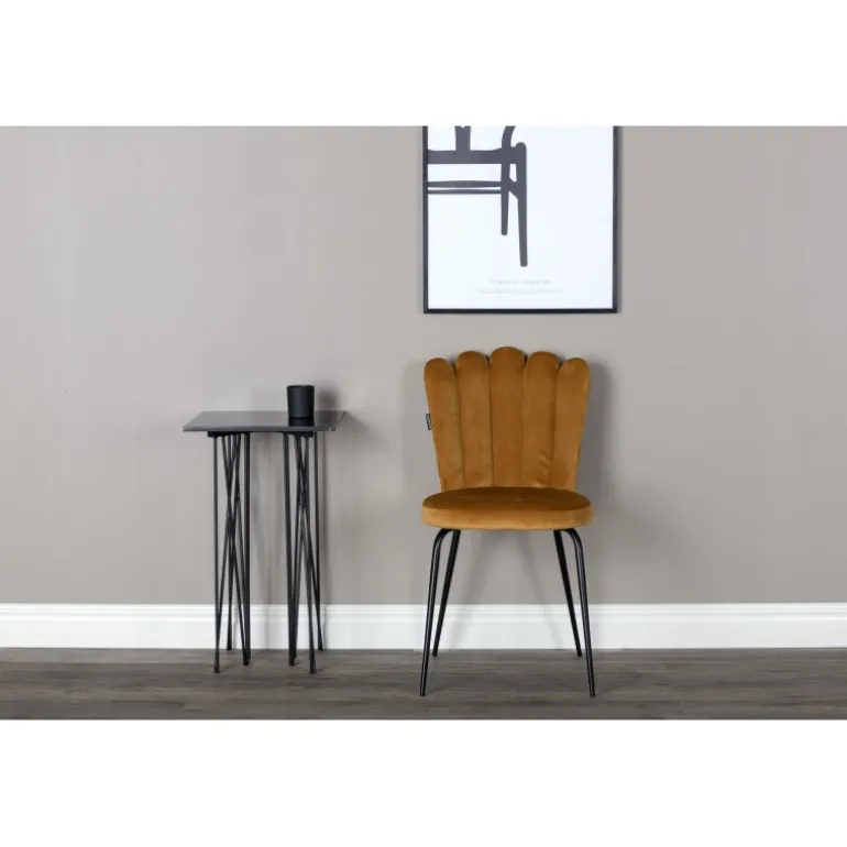 En moderne farveklik kan nemt løfte interiøret til næste niveau! Limhamn spisebordsstol er en moderne favorit i mange husstande. Den har et indbydende design med en dekorativ ormformet ryg med dekorative sømme og et rundt sæde i gult velourstof. Benene er i sort pulverlakeret metal. Skab en behagelig blikfang i hjertet af hjemmet! Lettere samling er påkrævet. Plejeråd: Brug tekstilspray til at imprægnere tekstilet, før du begynder at bruge det, det vil også gøre snavs og pletter lettere at fjerne i fremtiden. Fjern pletter med det samme, gnid ikke, men forsøg at suge op forsigtigt med en klud.
