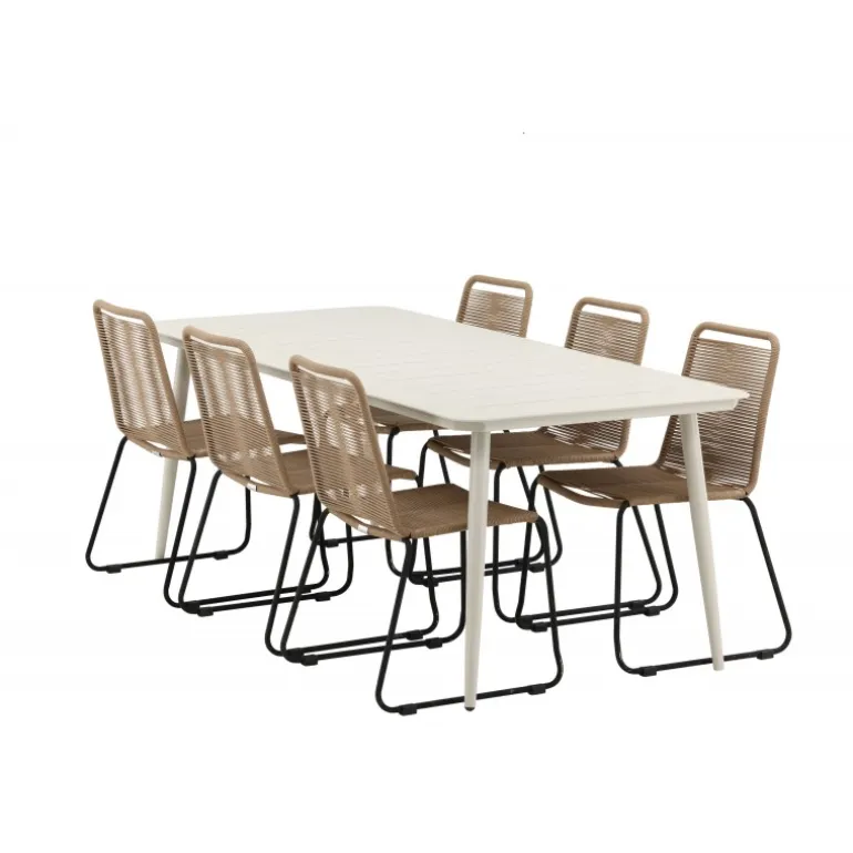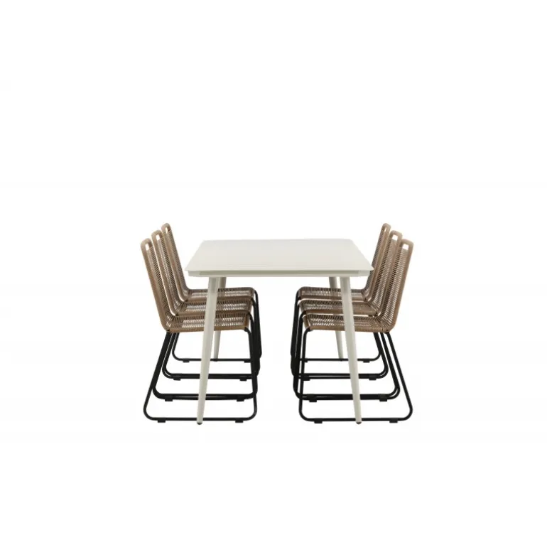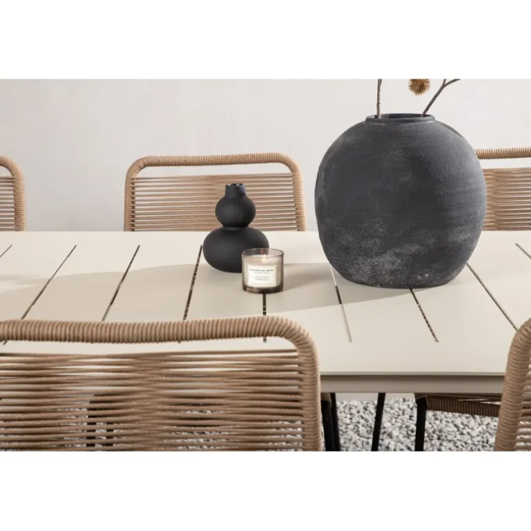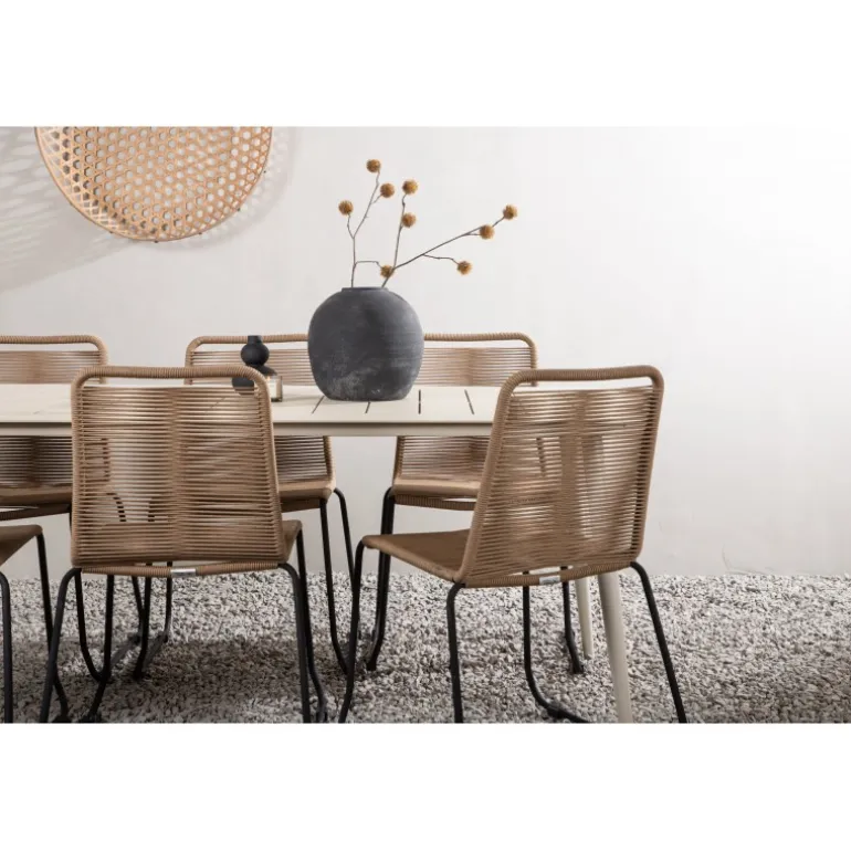 Skab et moderne blikfang i udestuen! Spisebordet Lina har en minimalistisk konstruktion i beige stål med en rektangulær bordplade og let skrånende ben. Her sammen med vores populære spisestole fra Lindos-serien. Stolen er lavet af holdbare materialer med et sæde i reb i en jordnær beige nuance og ben i sort metal. Her får du en spisestuegruppe, der både er komfortabel og en fryd for øjet! Bordmål: 200×90 cm.