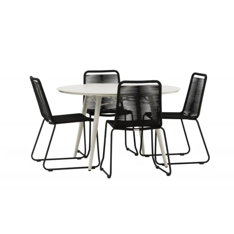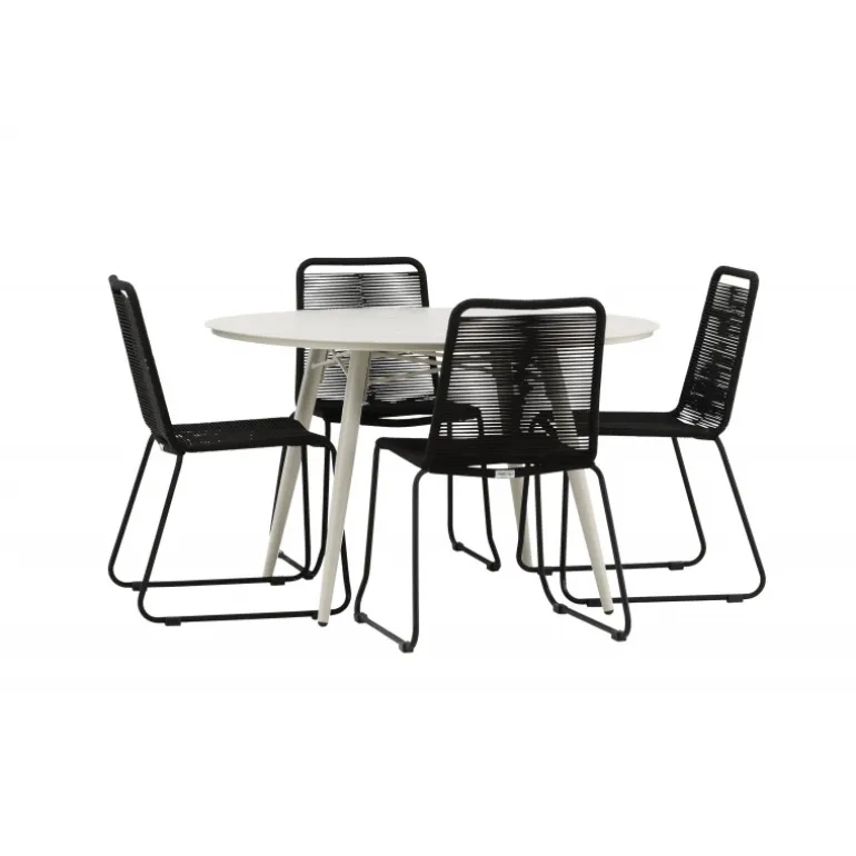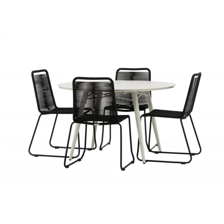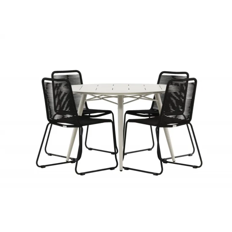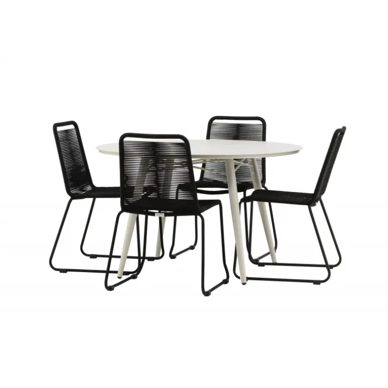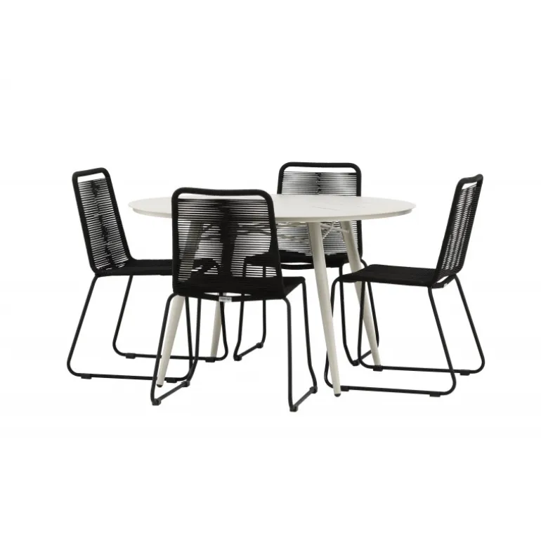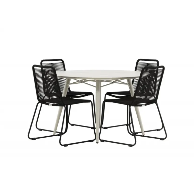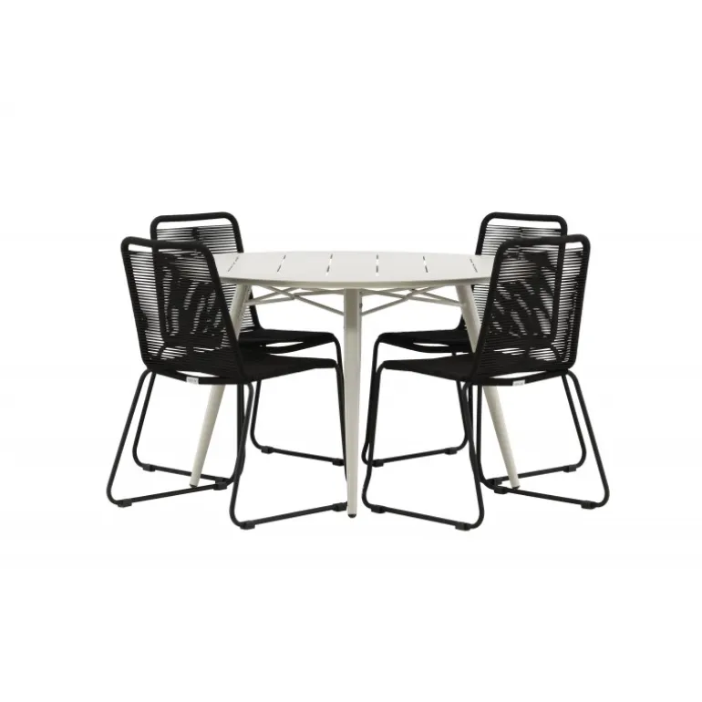 Det er et match – en moderne farvekombination, der skaber et modebevidst indtryk i udendørsområdet. Lina bordet har et minimalistisk design i hvid/beige stål, med en rektangulær bordplade og blødt afrundede kanter. Bordbenene er let udsvingede og giver et stabilt indtryk. Dimensioner: 200×90 cm. Her sammen med de trend-sikre spisebordsstole fra Lindos serien. Stolene har smalle ben i sort aluminium og et sæde i holdbart, sort reb. Indret indbydende på terrassen og skab et blikfang, der imponerer!