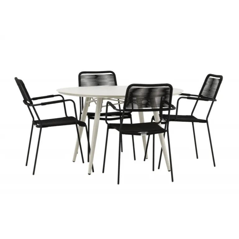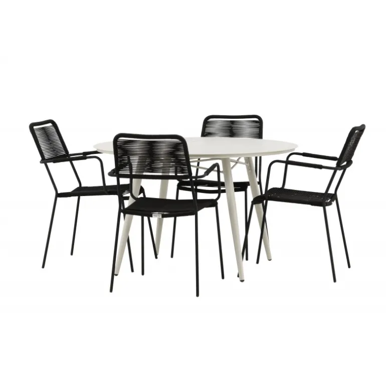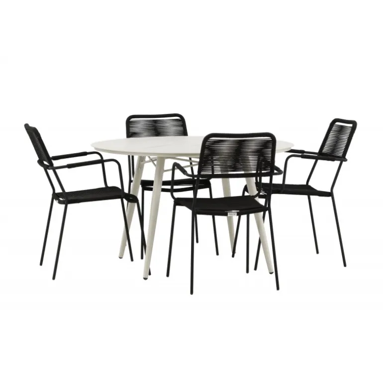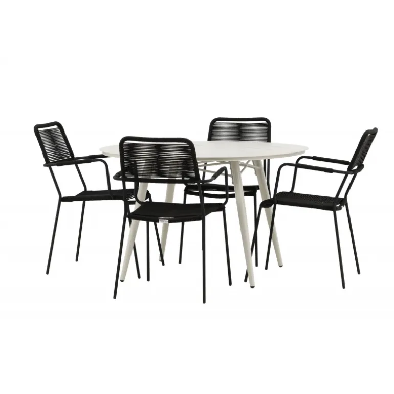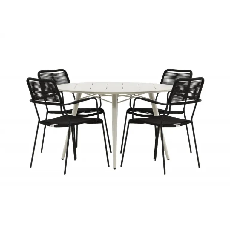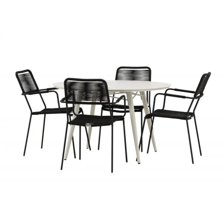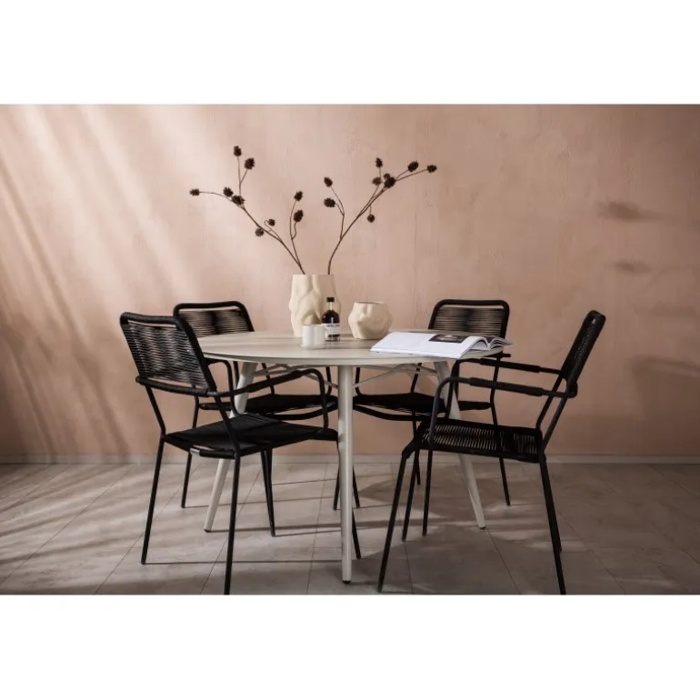 Det er et perfekt match – en moderne farvekombination, der skaber et modebevidst indtryk i udendørsområdet. Bordet Lina har et minimalistisk design i hvid/beige stål, med en rektangulær bordplade og bløde afrundede kanter. Bordbenene er let udadgående og giver et stabilt indtryk. Dimensioner: 200×90 cm. Her sammen med trendy spisebordsstole fra Lindos-serien. Stolene har integrerede armlæn i sort aluminium og et sæde i holdbart, sort reb. Skab en indbydende atmosfære på terrassen og skab et blikfang, der imponerer!