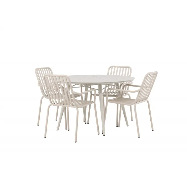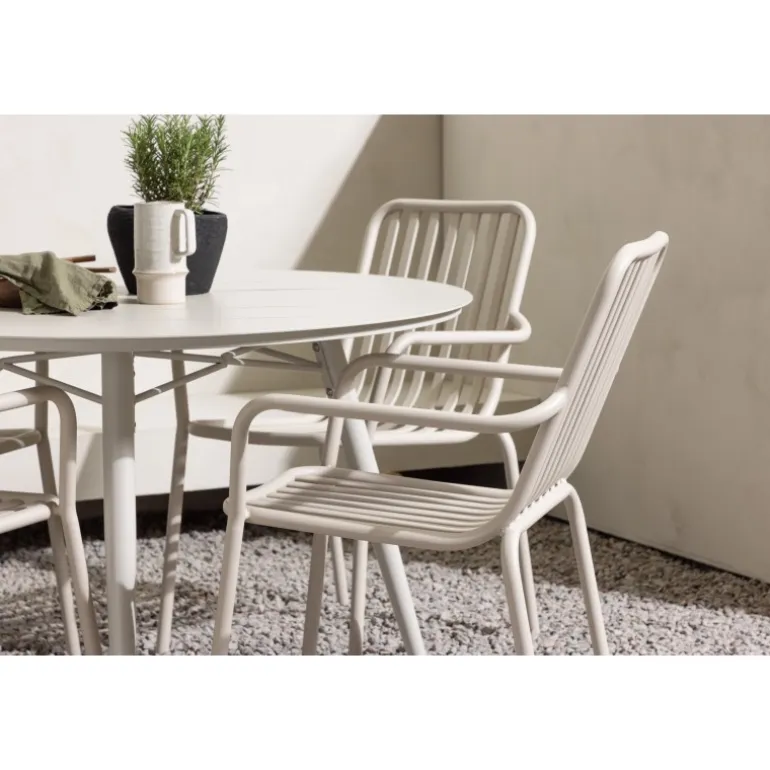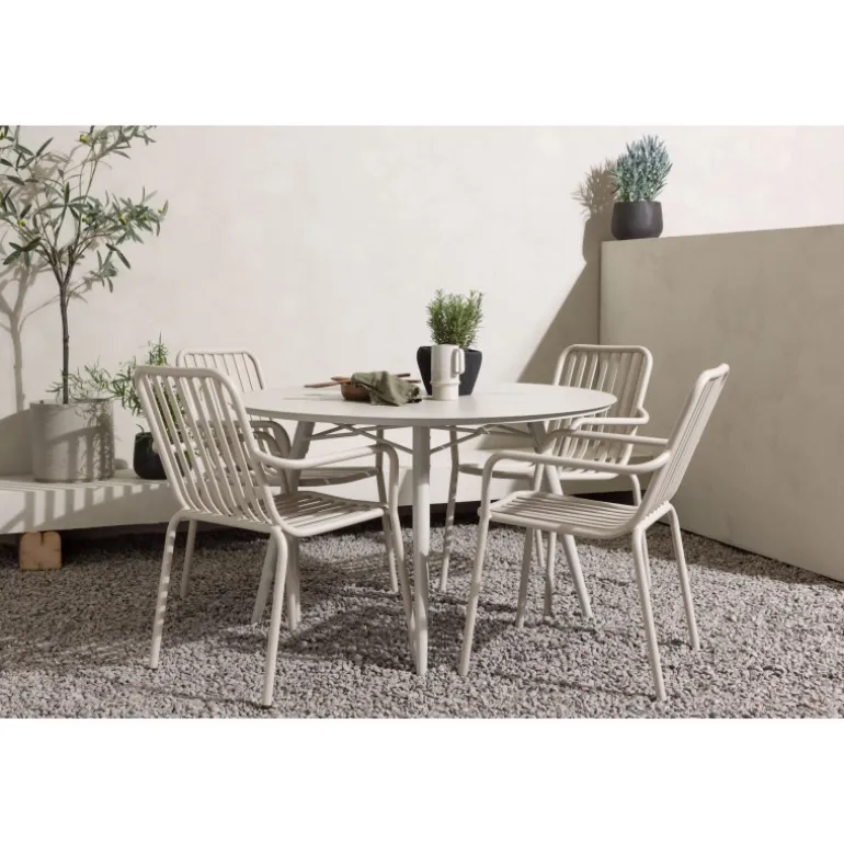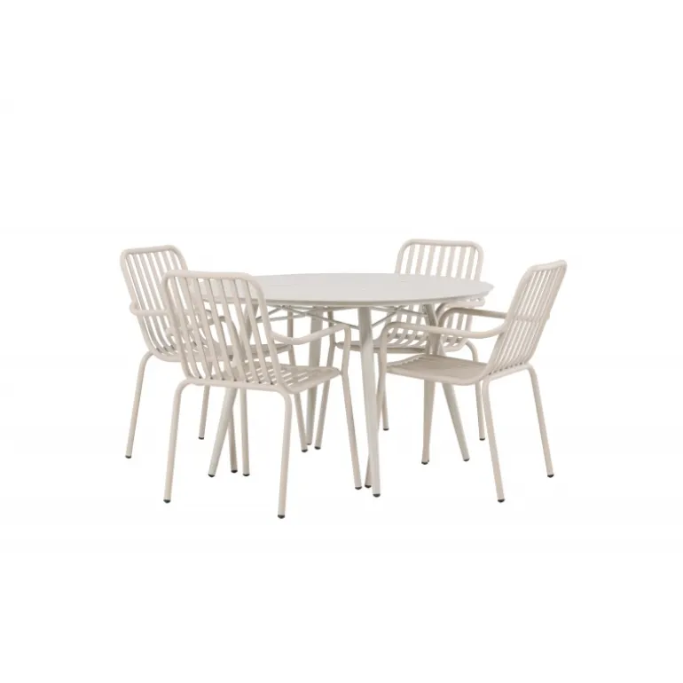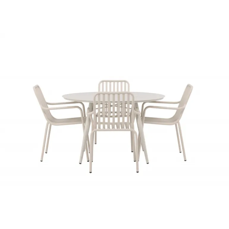 Møbler vinterhaven lys og frisk op! Det enkle, men elegante, runde spisebord fra Lina-serien har et klassisk design og varm beige farve. Bordpladen er tynd med dekorative revner, og bordbenene er let udsvingede; konsekvent lavet af stål. Her i en stilfuld kombination med 4 af vores moderne spisestole fra Beijing-serien. Stolens ribbede design og cremede beige farve får det til at føles både moderne og tidløst. Dette er en matchende Loungesæt – Havemøbelsæt, der aldrig går af mode! Bord diameter: 120 cm. Montering kræves.
