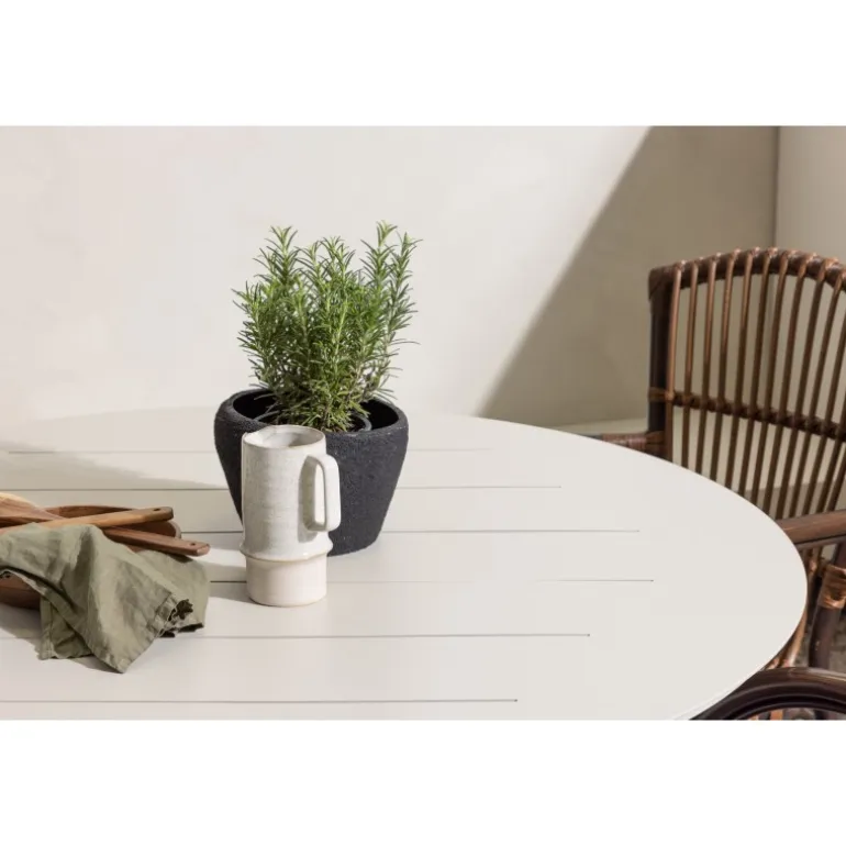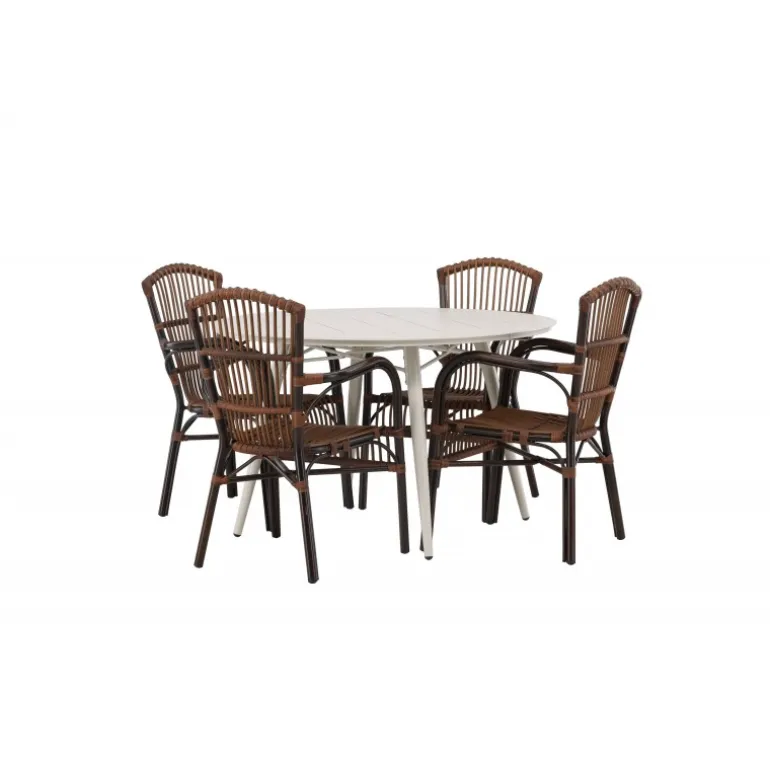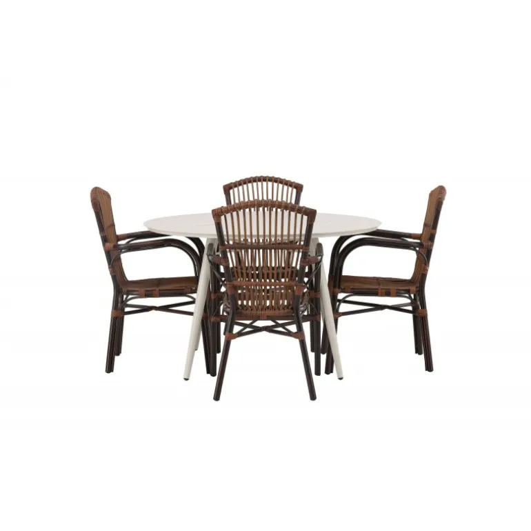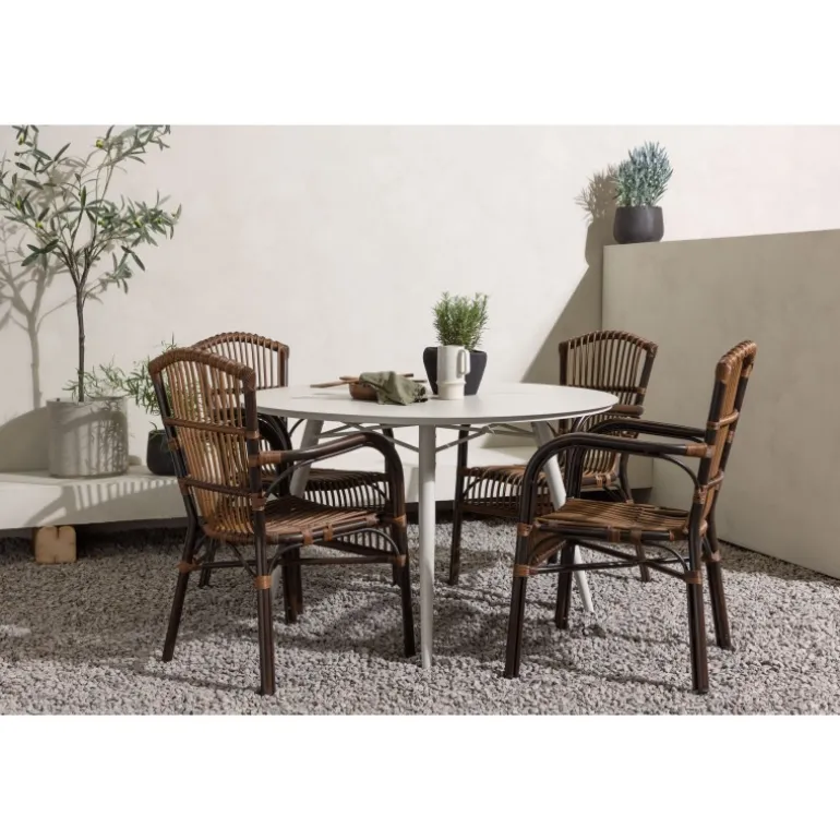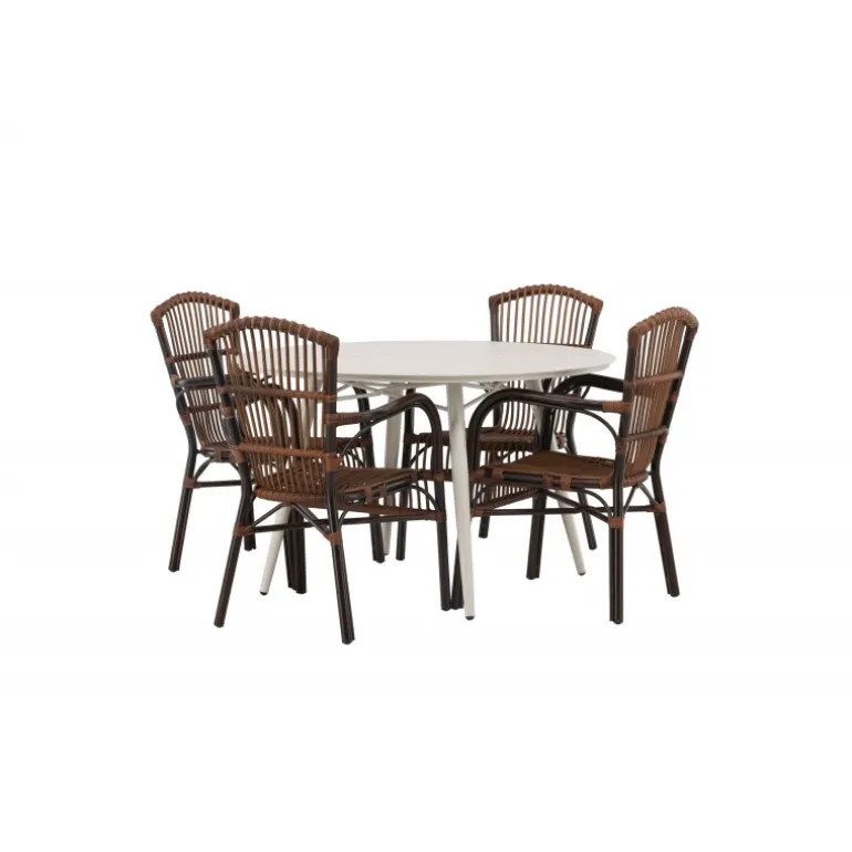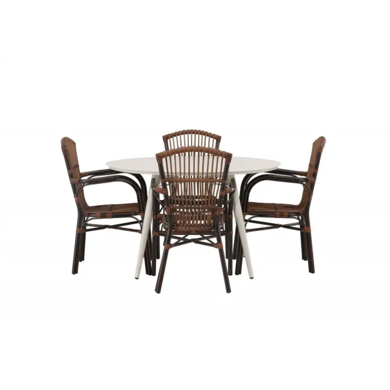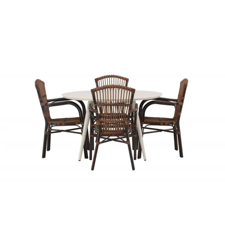 Skab et blikfang på terrassen, der imponerer dine gæster med dette forudsamlede Loungesæt – Havemøbelsæt! Det enkle, men elegante, runde spisebord fra Lina-serien har et friskt design og en varm beige farve. Bordpladen er tynd med dekorative revner, og bordbenene er let udvidede; konsekvent lavet af stål. Her sammen med 4 moderne stole fra Galera-serien. Stolen har en moderne valnøddefarve og et smagfuldt design i flettet rattanmateriale. Aluminiumsrammekonstruktionen er robust med høje armlæn for ekstra komfort. Dæk bordet udendørs denne sommer og lad tiden her være dagens højdepunkt! Borddiameter: 120 cm.