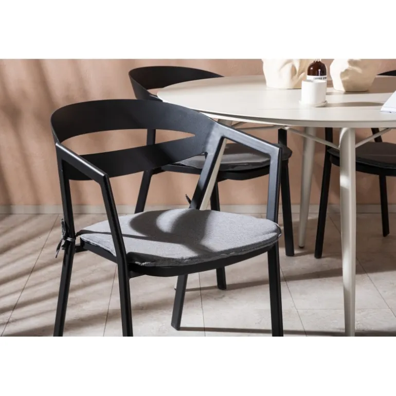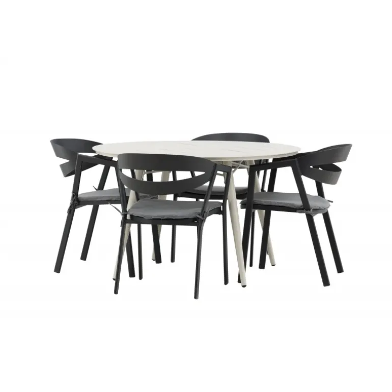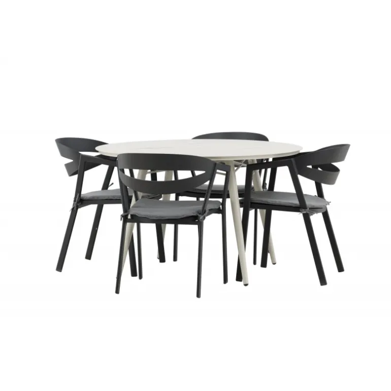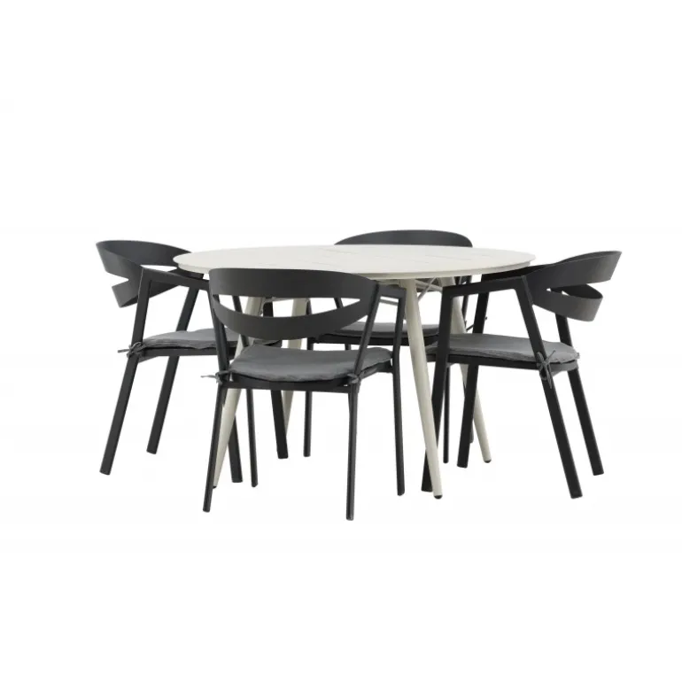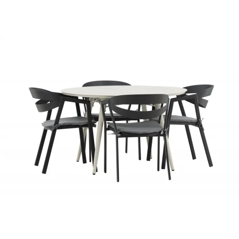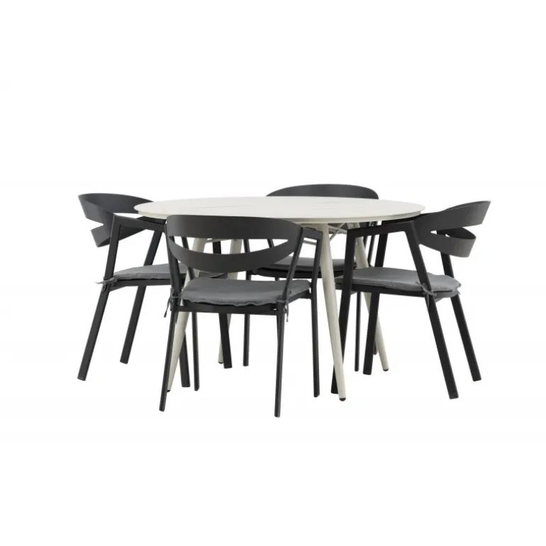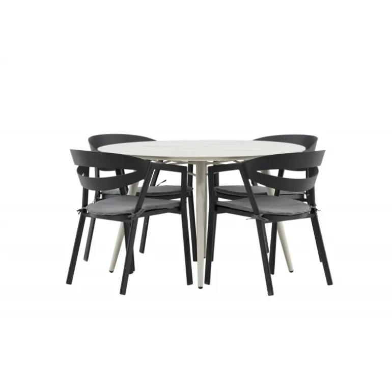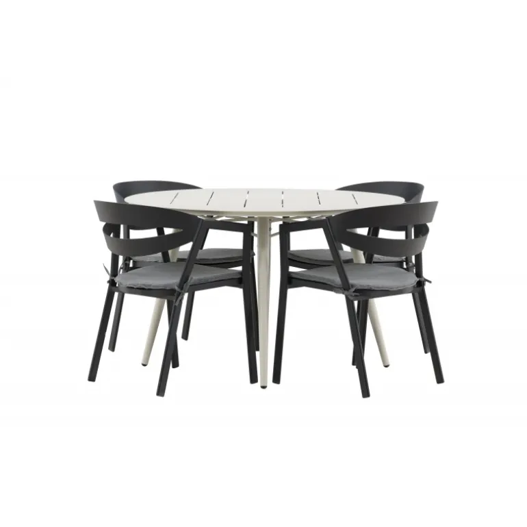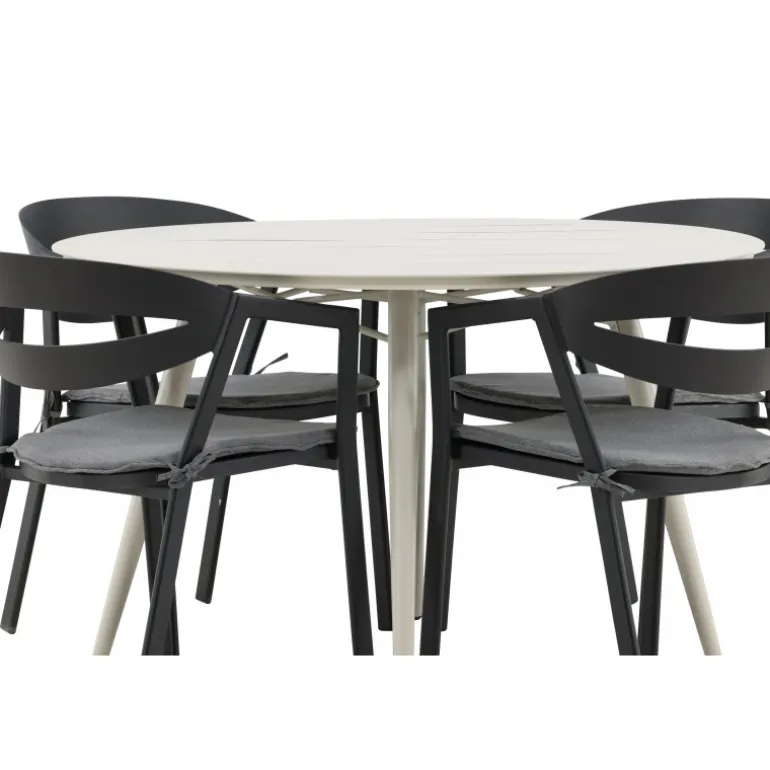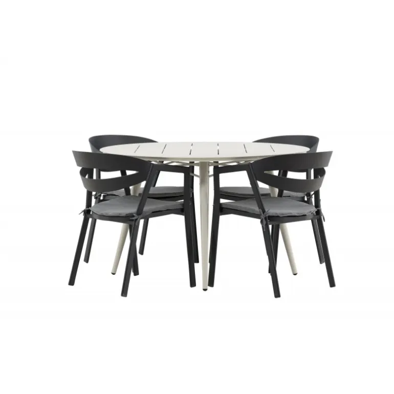 Et lækkert matchende Loungesæt – Havemøbelsæt er præcis, hvad der er nødvendigt for at friske terrassen op denne sommer! Bordet Lina har et minimalistisk design i hvid/beige stål med en rund bordplade og let udsvingende bordben. Dimensioner: 120ø cm. Her i en modebevidst kombination med spisestole fra serien WORD. Stolene har integrerede armlæn i sort aluminium og en grå pude for ekstra komfort. Sid behageligt og nyd hyggelige måltider!