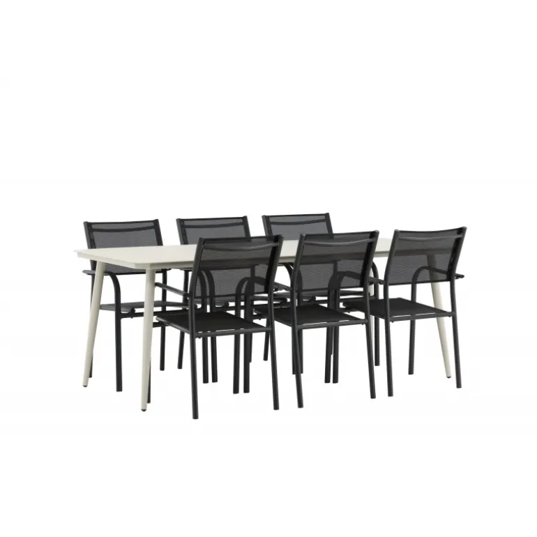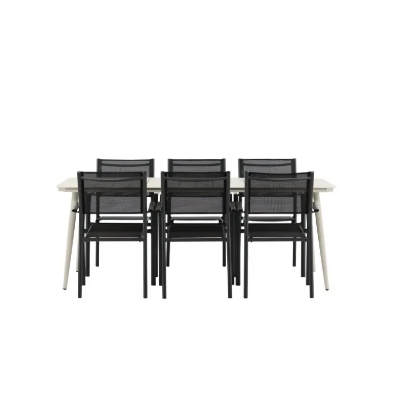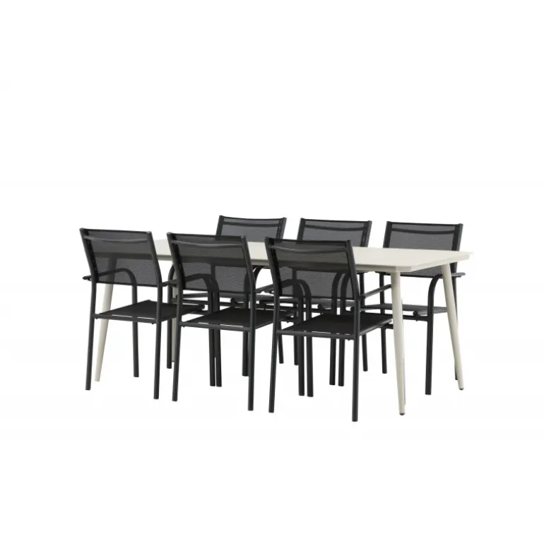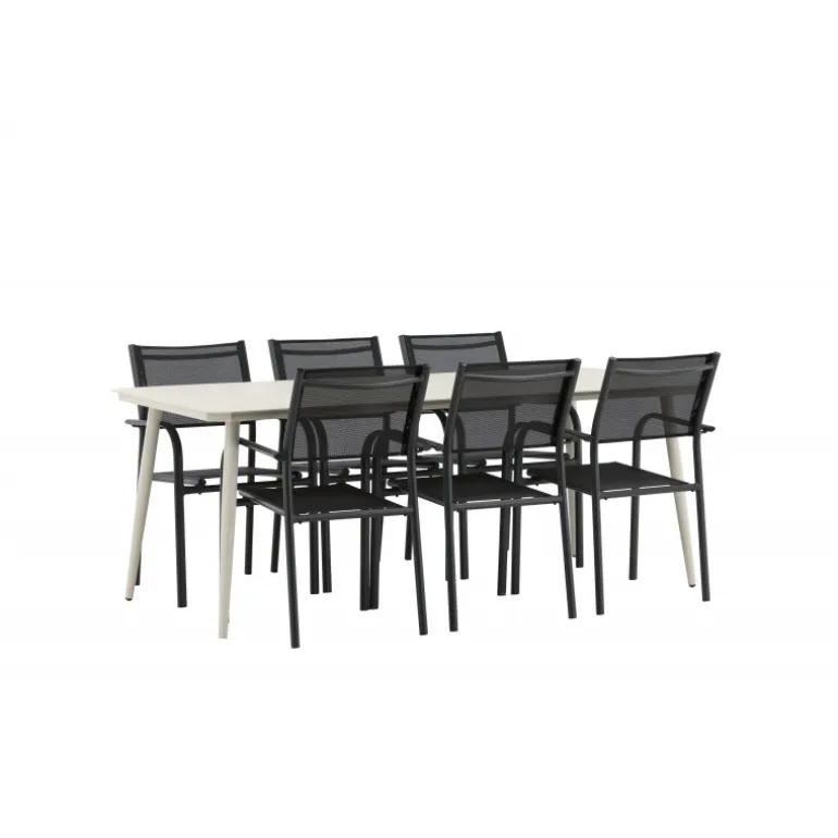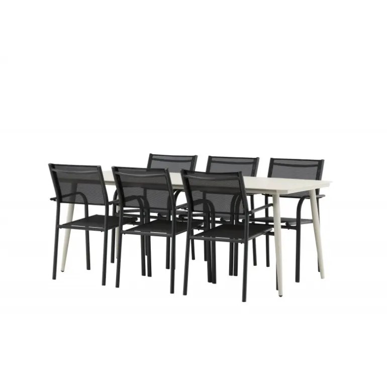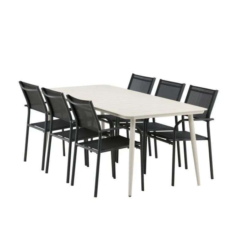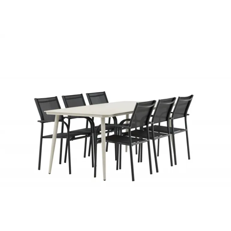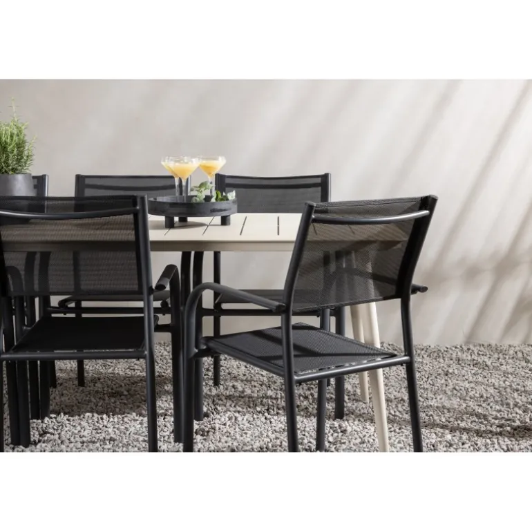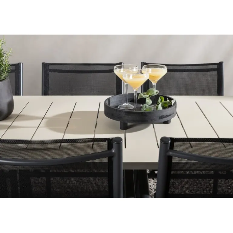 Det er et match – en moderne farvekombination, der skaber et modebevidst indtryk i udendørsområdet. Lina-bordet har et minimalistisk design i hvid/beige stål med en rektangulær bordplade og bløde afrundede kanter. Bordbenene er let udadgående og giver et stabilt indtryk. Dimensioner: 200×90 cm. Her sammen med komfortable spisestole fra Santorini-serien. Stolene har lige nordiske former med integrerede armlæn i aluminium og sæde i sort tekstil. Lad tiden her blive dagens højdepunkt!