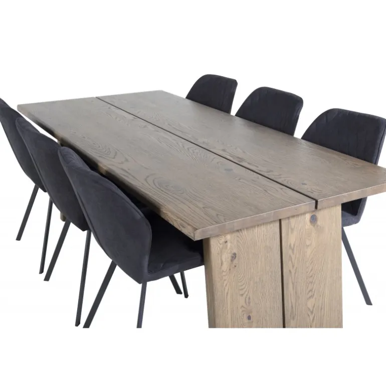 En madgruppe med et rustikt og stilfuldt design! Logger, vores udtrækkelige spisebord i en trendy træfinish, er her kombineret med klassiske spisebordsstole fra Gemma-serien. Lad hjemmets hjerte præges af din nye madgruppe, som indgyder en varm og luksuriøs følelse. Logger Rektangulær Spisebordssæt er perfekt til at skabe en indbydende spiseoplevelse. Med en robust egetræsbordplade og elegante sorte stole, tilbyder dette sæt både funktionalitet og æstetik.