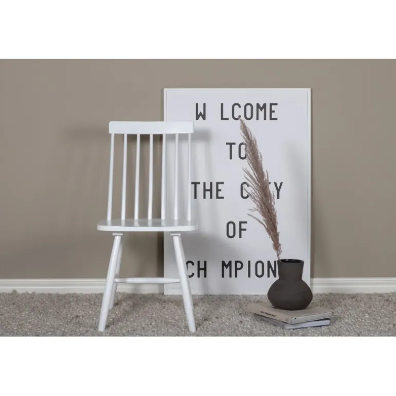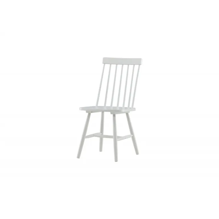 En pindstol/spisestol i nostalgisk stil fra Lonneberga-serien. Det stilfulde design er både moderne og praktisk. Fremstillet af gummitræ i en behagelig hvid farve. Supplér med et lækkert spisebord og skab en flot blikfang i hjemmets hjerte! Lettere montering er påkrævet. Vedligeholdelsesråd: Gummitræ er ofte lakeret eller malet med en farvepigment, der giver en dækkende/ikke-gennemsigtig overflade. Hvide lakoverflader kan være ekstra følsomme over for forskellige farvestoffer, der findes i madvarer, sodavand, rødvin og kaffe. Sørg for at fjerne pletter så hurtigt som muligt og fugt overfladen med en godt opvredet rengøringsklud og sæbeopløsning. Brug en støveklud til at tørre overfladen igen.