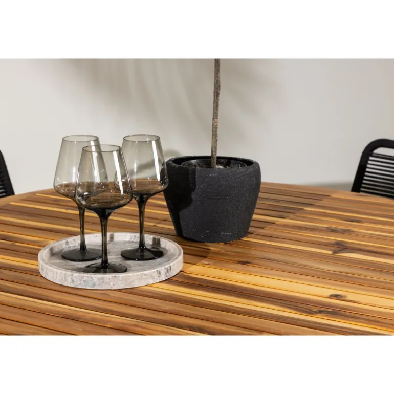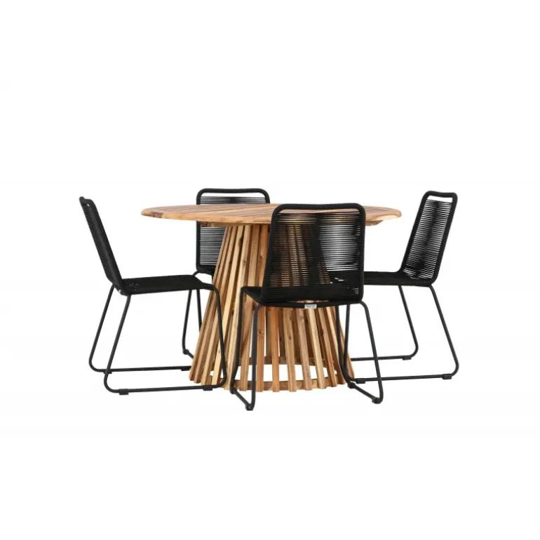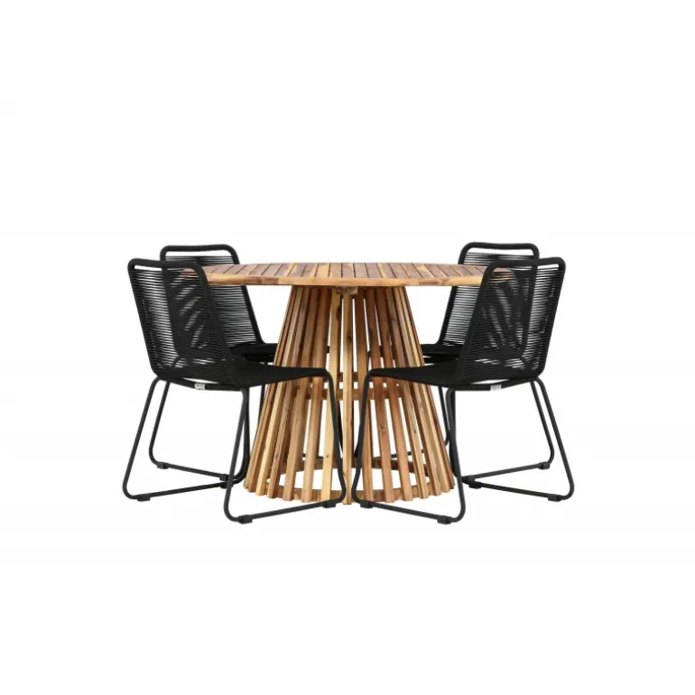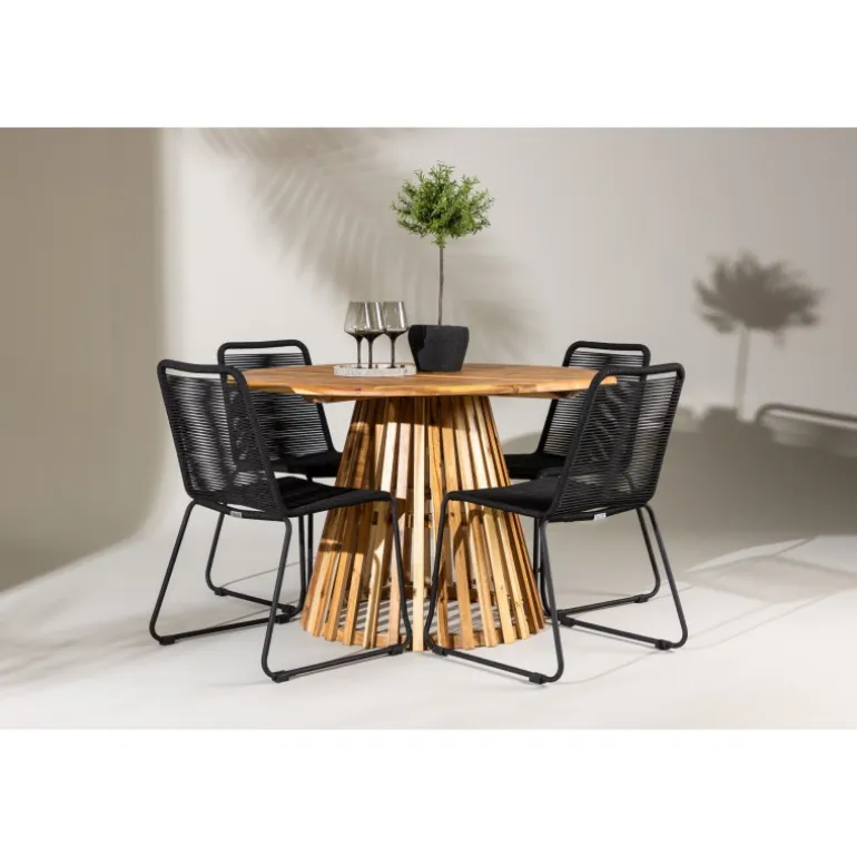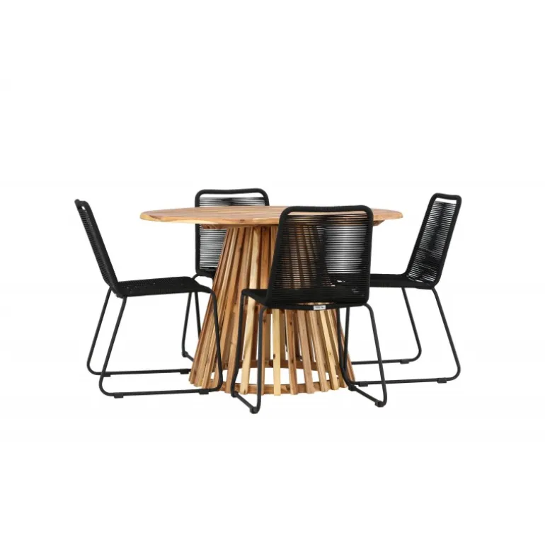 Oplev det ultimative Loungesæt – Havemøbelsæt til dit udendørs område med vores elegante Lumpur bord og stilfulde Lindos stole. Med en imponerende diameter på 120 cm tilbyder Lumpur bordet masser af plads til familiemiddage og hyggelige sammenkomster under åben himmel. Fremstillet af akacietræ giver Lumpur bordet en naturlig og indbydende atmosfære til dit udendørs miljø. Dets naturlige farve blender perfekt med omgivelserne, hvilket skaber en fredfyldt stemning, som du og dine gæster vil elske. Lindos stolene er lavet af stål, hvilket giver dem en robust og holdbar konstruktion til udendørs brug. Stolens elegante sorte farve tilfører et sofistikeret touch til din udendørs spisestue og komplementerer bordets naturlige træfarve på en stilfuld måde. Dette Loungesæt – Havemøbelsæt leveres komplet med fire komfortable stole, ideelle til afslappende måltider og sociale sammenkomster udendørs. Med Lumpur og Lindos Loungesæt – Havemøbelsættet kan du skabe et indbydende og stilfuldt udendørs miljø, hvor din familie og gæster kan nyde hinandens selskab fuldt ud.