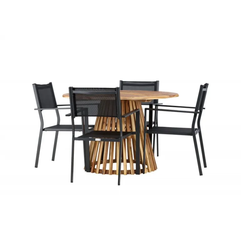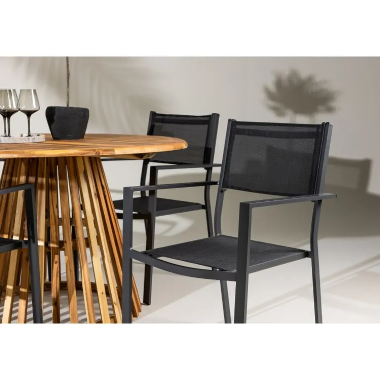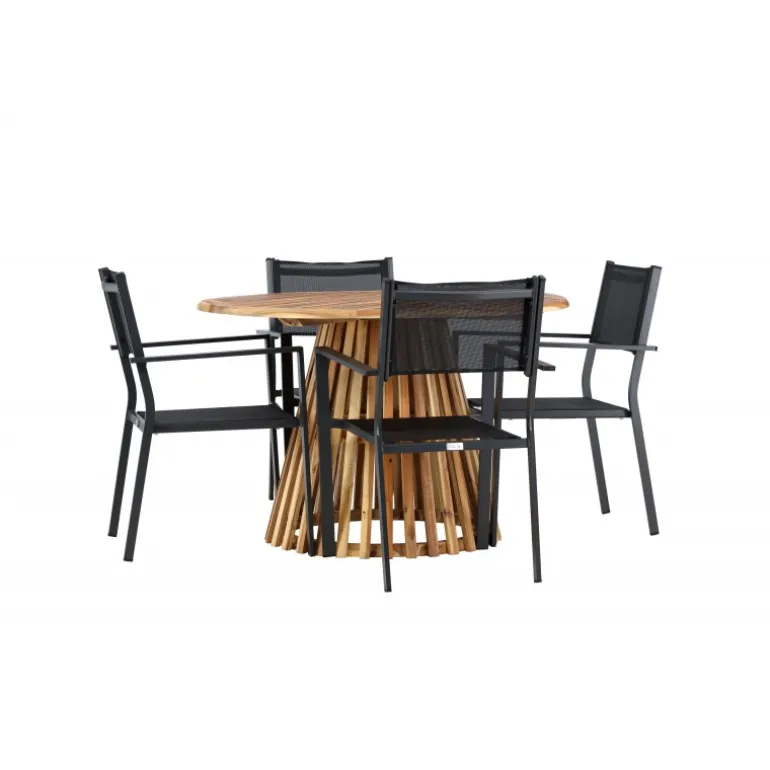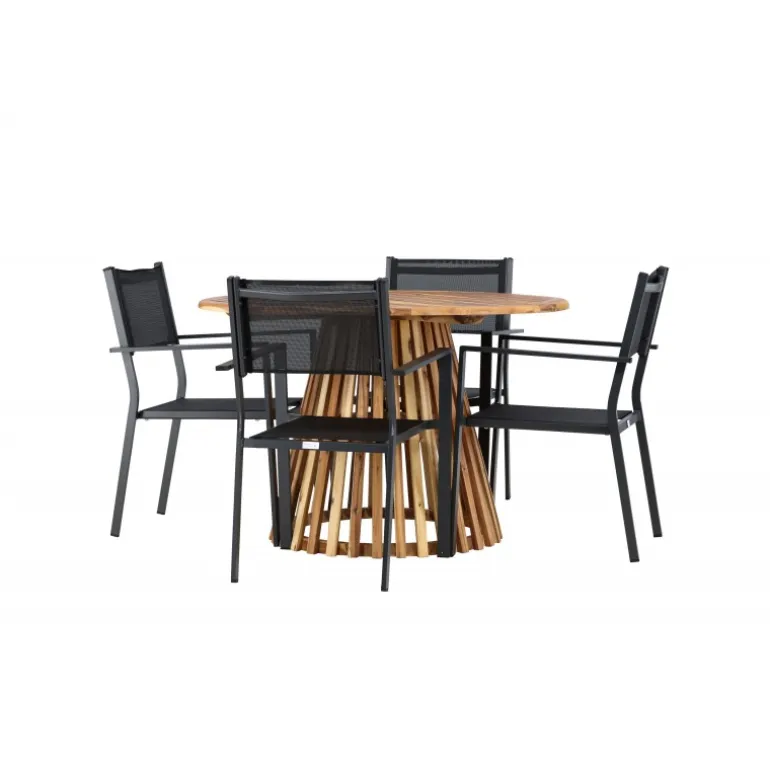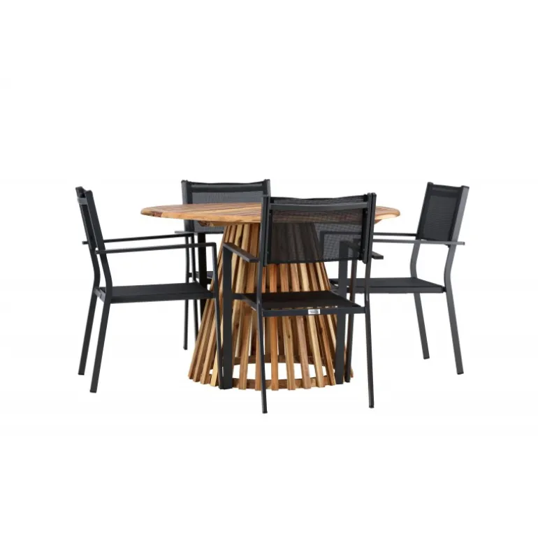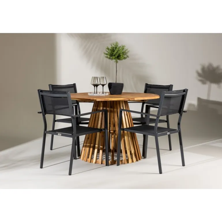 Opdag det perfekte Loungesæt – Havemøbelsæt til dit hjem med Lumpur bordet og Copacabana stolene. Med en diameter på 120 cm, tilbyder Lumpur bordet generøs plads til familiemiddage og sammenkomster med venner. Fremstillet af bæredygtigt akacietræ, bringer bordet en naturlig følelse til din spisestue eller terrasse. Copacabana stolene komplementerer Lumpur bordet med deres moderne design og pålidelige aluminiumskonstruktion. Stolene i sort farve tilføjer et elegant touch til din spisestue og blander sig perfekt med bordets naturlige træfarve. Dette Loungesæt – Havemøbelsæt inkluderer fire komfortable stole, perfekt til familiemiddage og sociale sammenkomster. Uanset om det er hverdagens måltider eller specielle lejligheder, skaber Lumpur og Copacabana Loungesæt – Havemøbelsættet en indbydende atmosfære og et elegant look til dit hjem.
