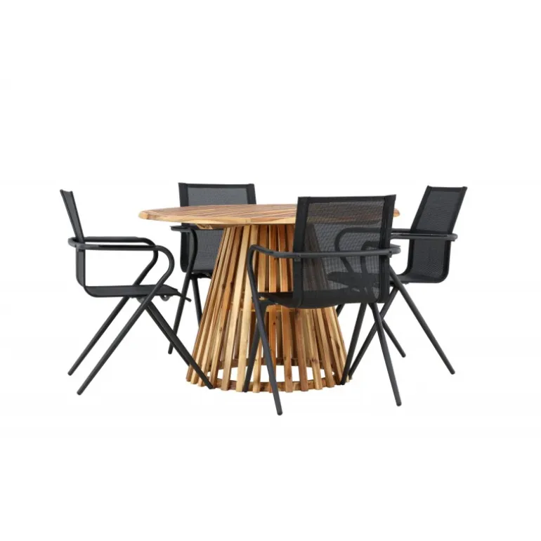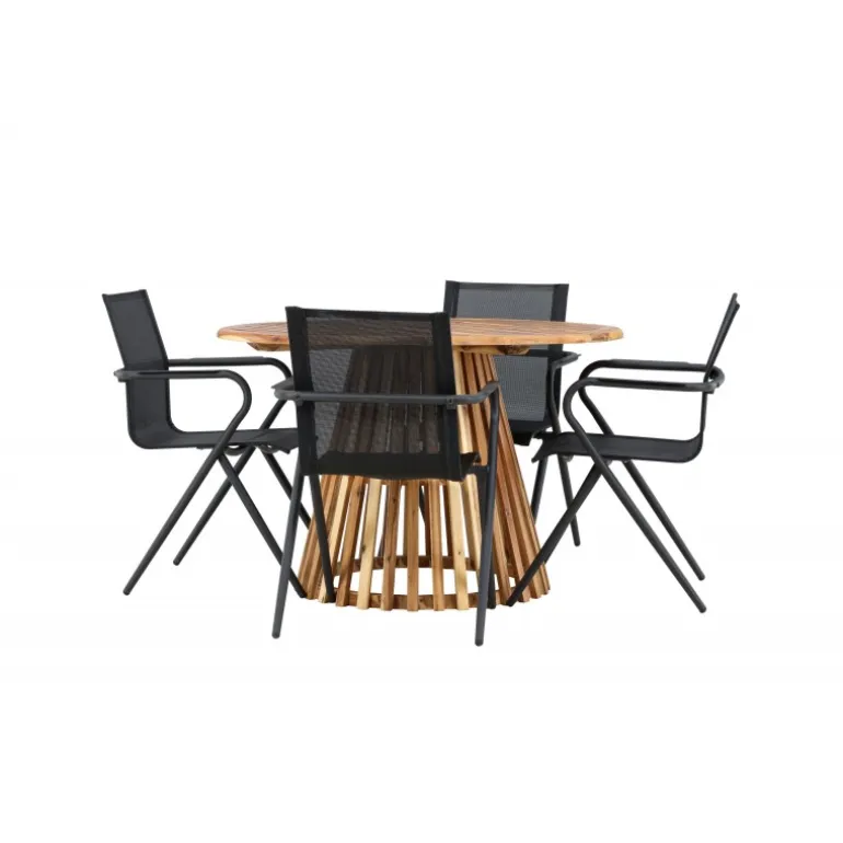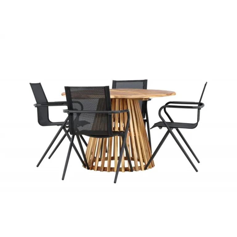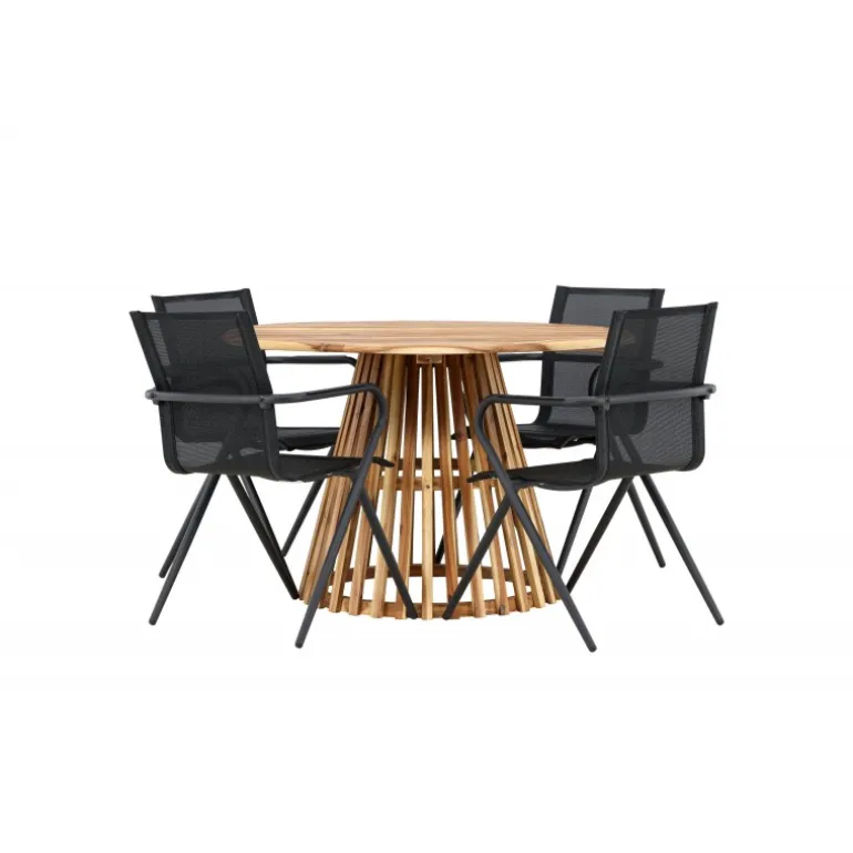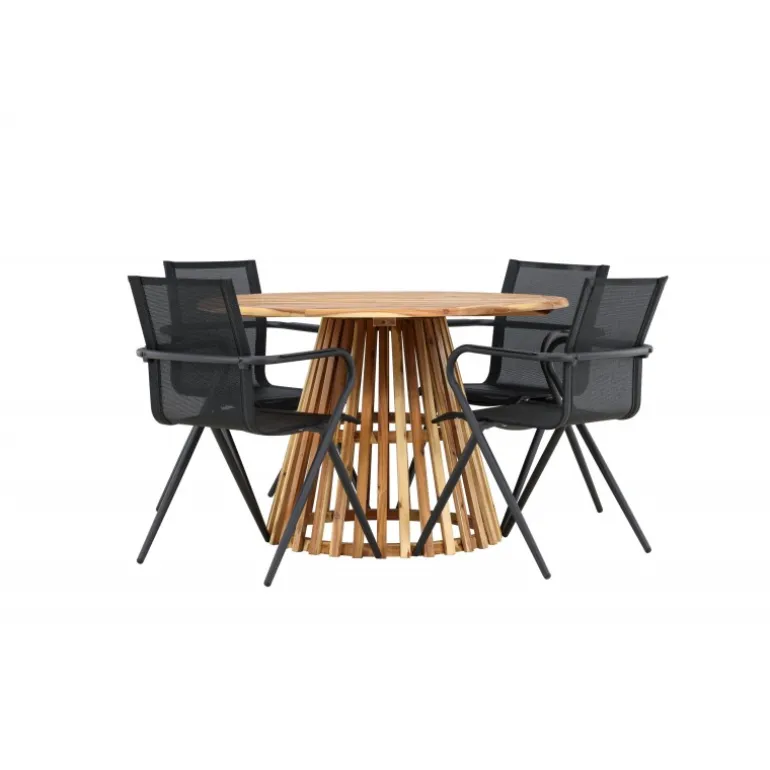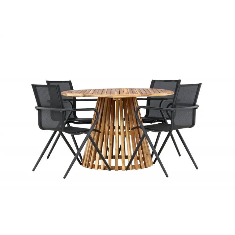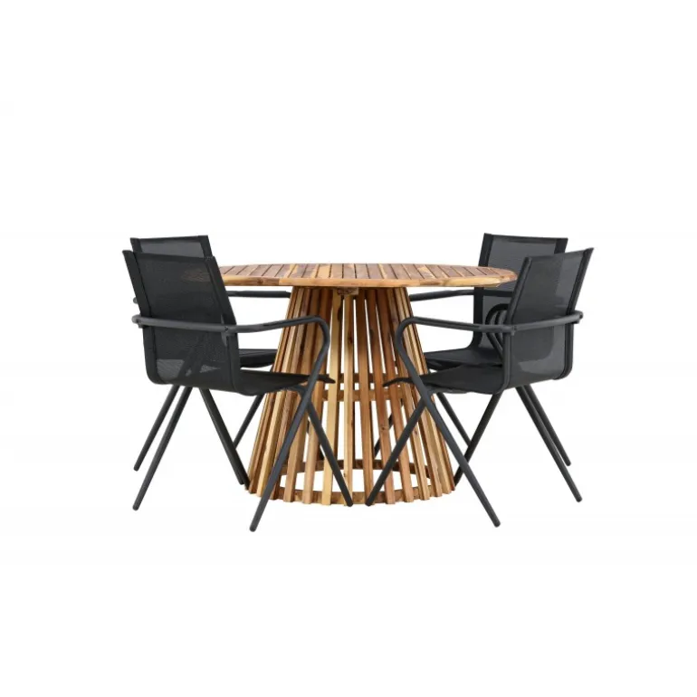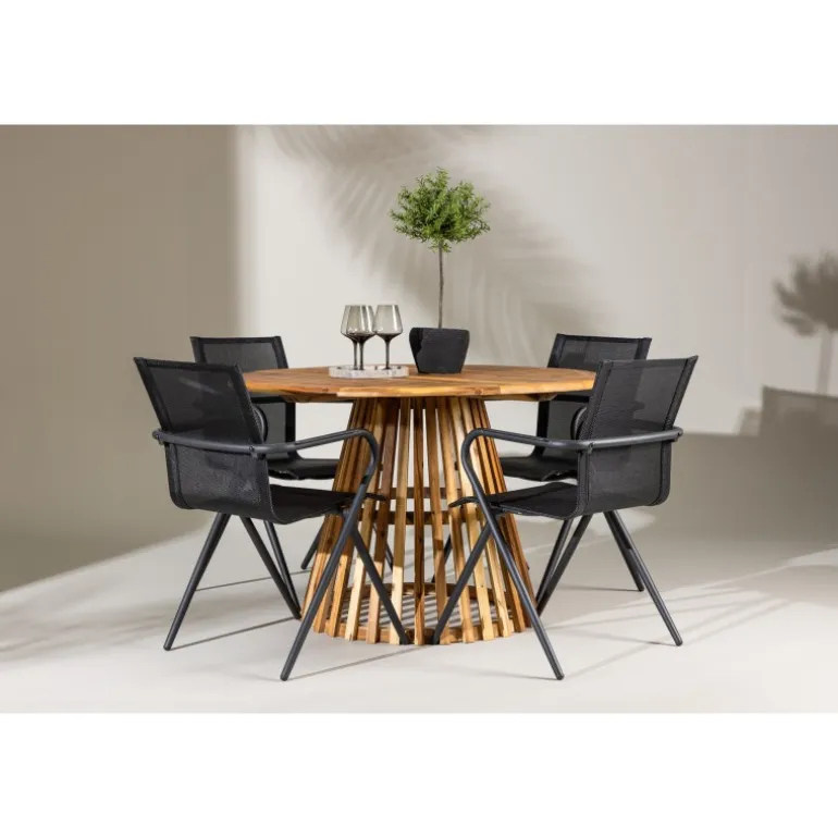 Oplev det perfekte Loungesæt – Havemøbelsæt til din terrasse eller have med vores elegante Lumpur bord og stilfulde Alina stole. Med en imponerende diameter på 120 cm giver Lumpur bordet masser af plads til familiemiddage og hyggelige sammenkomster under åben himmel. Fremstillet af akacietræ tilbyder Lumpur bordet en naturlig og indbydende atmosfære til dit udendørsmiljø. Den naturlige farve blander sig harmonisk med omgivelserne, hvilket skaber en fredelig atmosfære, hvor du og dine gæster kan slappe af og nyde lækre måltider. Alina stolene er lavet af aluminium, hvilket giver dem en holdbar konstruktion, der er egnet til udendørs brug. Stolens slanke sorte farve tilføjer et sofistikeret touch til din udendørs spisestue og komplementerer den naturlige træfarve på bordet på en stilfuld måde. Dette Loungesæt – Havemøbelsæt leveres komplet med fire komfortable stole, perfekt til afslappede måltider og sociale sammenkomster udendørs. Med Lumpur og Alina Loungesæt – Havemøbelsættet kan du skabe et indbydende og stilfuldt udendørsmiljø, hvor din familie og gæster kan nyde sig fuldt ud.