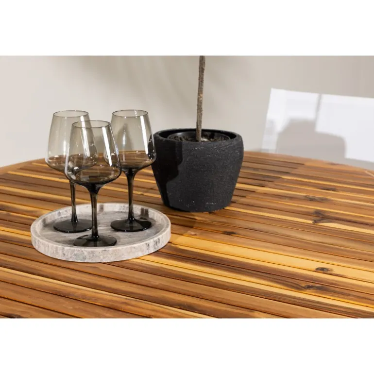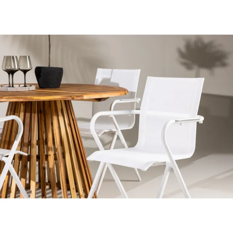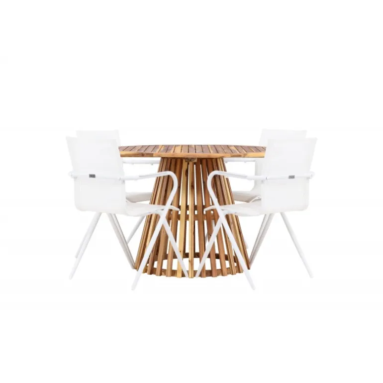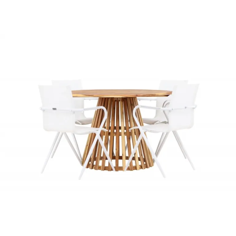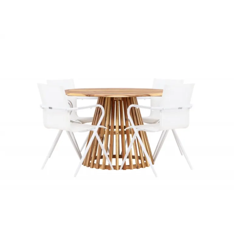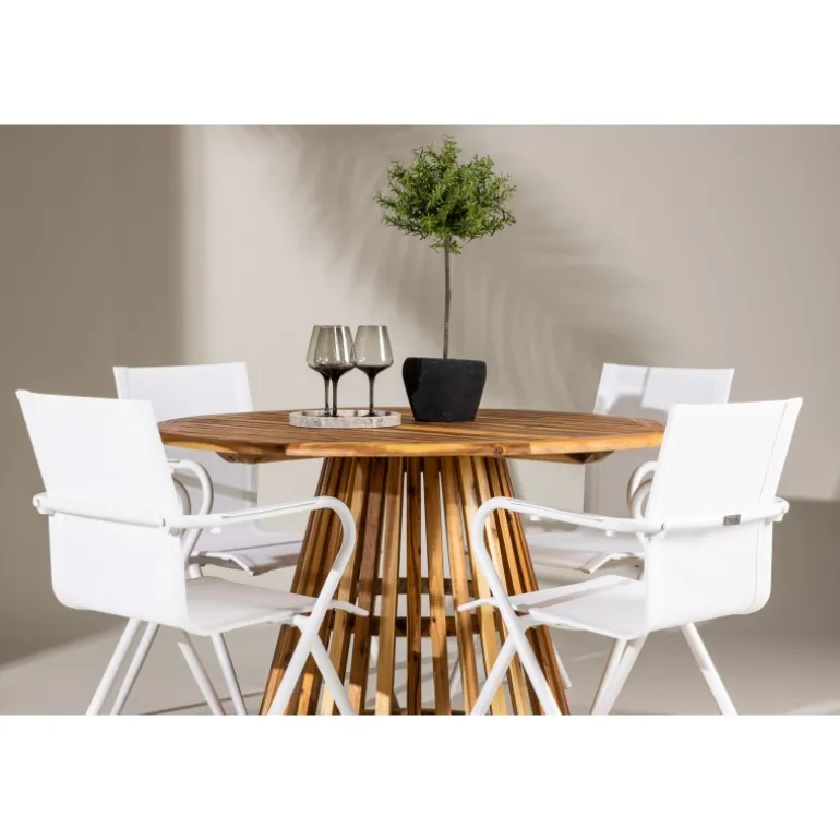 Oplev den perfekte fusion af moderne design og jordnær atmosfære med vores Loungesæt – Havemøbelsæt Alina og Lumpur. Dette elegante udendørs møbel er ideelt til at skabe mindeværdige øjeblikke med venner og familie på varme dage og lune aftener. Med fire slanke Alina stole og det charmerende Lumpur bord tilføjer dette Loungesæt – Havemøbelsæt et trendy touch til din terrasse eller have. Alina stolene, i en frisk hvid farve og med komfortable textilene sæder, kombinerer stil og komfort. Deres aluminiumsben giver stabilitet uden at gå på kompromis med designet. Lumpur bordet er midtpunktet i dette ensemble med sin naturlige farve og en diameter på 120 cm, lavet af akacietræ. Dets robuste konstruktion gør det til et pålideligt og holdbart udendørs møbel. Uanset om du samles til en afslappet grill-aften eller en festlig udendørs middag, vil Alina og Lumpur Loungesæt – Havemøbelsæt skabe en indbydende og stilfuld atmosfære, hvor fællesskab og samvær trives. Forbedr din udendørs oplevelse med dette stilfulde og funktionelle Loungesæt – Havemøbelsæt.