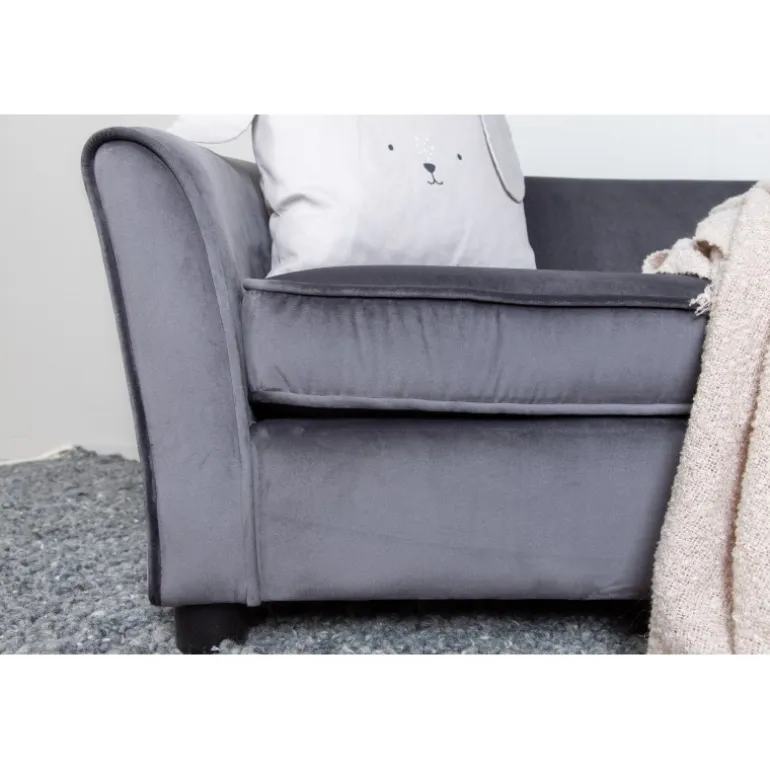 Dekorer børneværelset med vores bløde og hyggelige Måna Børnesofa. Sofaen er lavet af mørkegrå velourstof og sorte plastikben. Måna Børnesofa er designet til at give maksimal komfort til dine børn med en sædebredde på 72 cm, sædedybde på 44 cm og en sædehøjde på 33 cm. Perfekt til at skabe et indbydende og stilfuldt rum, hvor børn kan slappe af og lege.