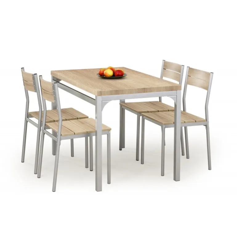 Opgrader din spisestue med MALCOLM bord + 4 Spisebordsstole i farven sonoma eg. Dette stilfulde sæt inkluderer et robust bord og fire komfortable Spisebordsstole, perfekt til daglige måltider eller særlige sammenkomster. Bordet måler 110/70/75 cm, og dets overflade er lavet af lamineret celleplade, hvilket gør det nemt at rengøre og vedligeholde. Spisebordsstolenes sæder er lavet af lamineret MDF, mens både bordets og Spisebordsstolenes rammer er fremstillet af pulverlakeret stål for ekstra holdbarhed. Med sin elegante sonoma eg farve tilføjer dette sæt et moderne touch til enhver spisestue.