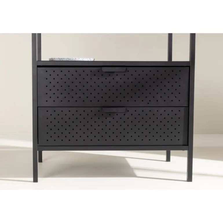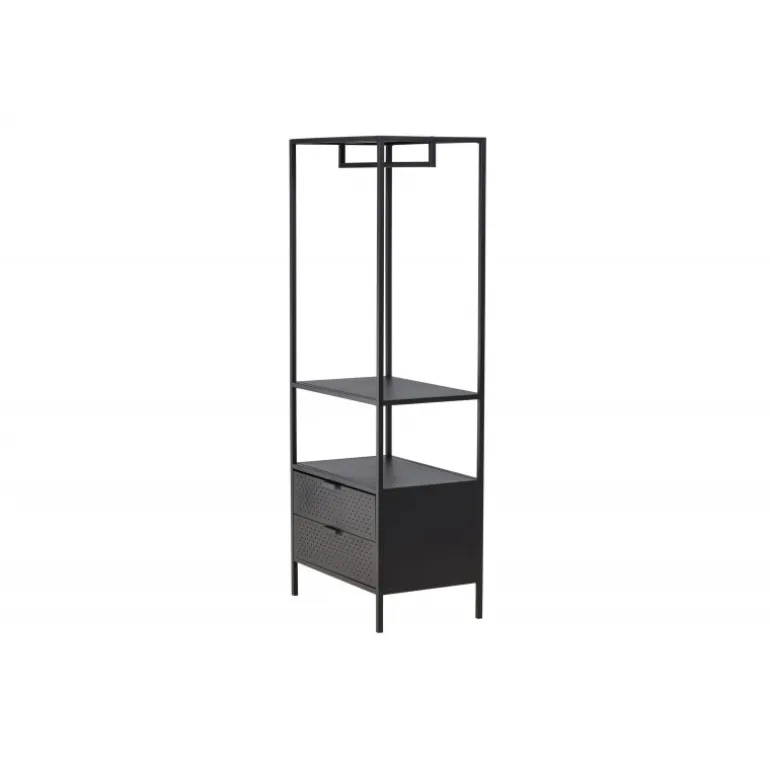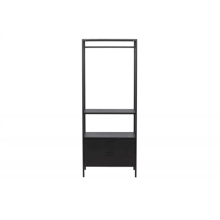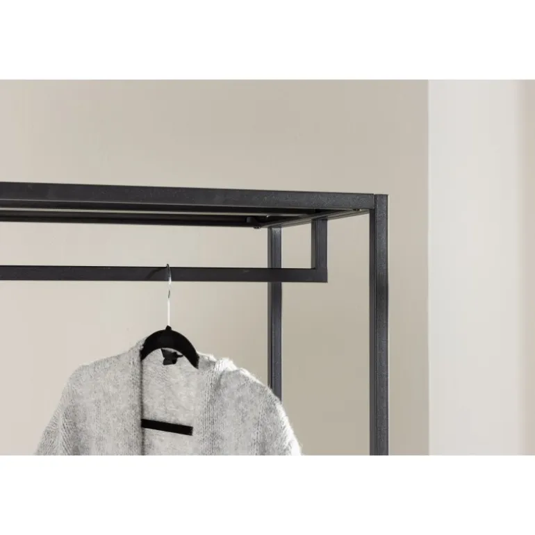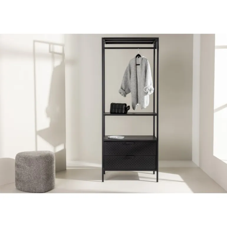 Skab orden og stil med Malibu – vores sorte tøjstativ i nordisk design! Med sit moderne skandinaviske design bringer det en følelse af minimalistisk elegance til dit hjem. Men frem for alt tilbyder dette tøjstativ meget mere end bare et sted at hænge dit tøj. Bemærk hvordan stressen smelter væk, når du ser din hverdag organiseret og i perfekt orden. Her kan du nyde fordelene ved skjult opbevaring med to rummelige skuffer i bunden. Der er også en lav hylde, som er skræddersyet til dine sko og foldede jeans. Kvalitetsfremstillet i sort stål. Simpelt og tilgængeligt – præcis som det skal være. Tag en dyb indånding og føl, hvordan de små ting kan gøre en stor forskel i din morgenrutine. Vores mål er ikke blot at levere møbler, men at give dig en oplevelse. Vores sorte tøjstativ er ikke kun møbler; det er nøglen til et mere organiseret og stilfuldt liv, og det bliver også en stilfuld interiørdetalje i dit hjem. Velkommen til en hverdag, hvor orden og skønhed går hånd i hånd!