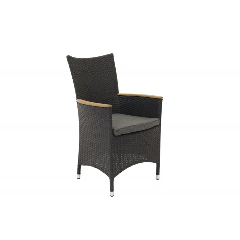 Skab et moderne look på din terrasse denne sommer! I denne sorte armstol fra Malin-serien kan du nyde mange middage med dine kære i løbet af sommeren. Med en ramme i aluminium og kunstig rattan får du en solid og holdbar stol, der holder over tid. Armlænene er i teak som en lækker detalje. Sid behageligt denne sommer og nyd skønne måltider udendørs! Plejevejledning: Konstrite er et plastmateriale, der er perfekt til vores skandinaviske klima. Materialet er UV-resistent og kan modstå vejr og vind. UV-resistens betyder, at møblerne ikke falmer, men vi anbefaler altid at opbevare møblerne under et møbelbetræk eller et andet tørt og køligt sted for at forlænge levetiden.