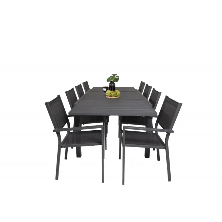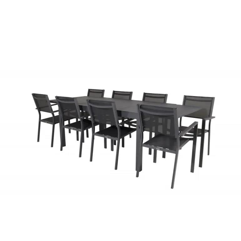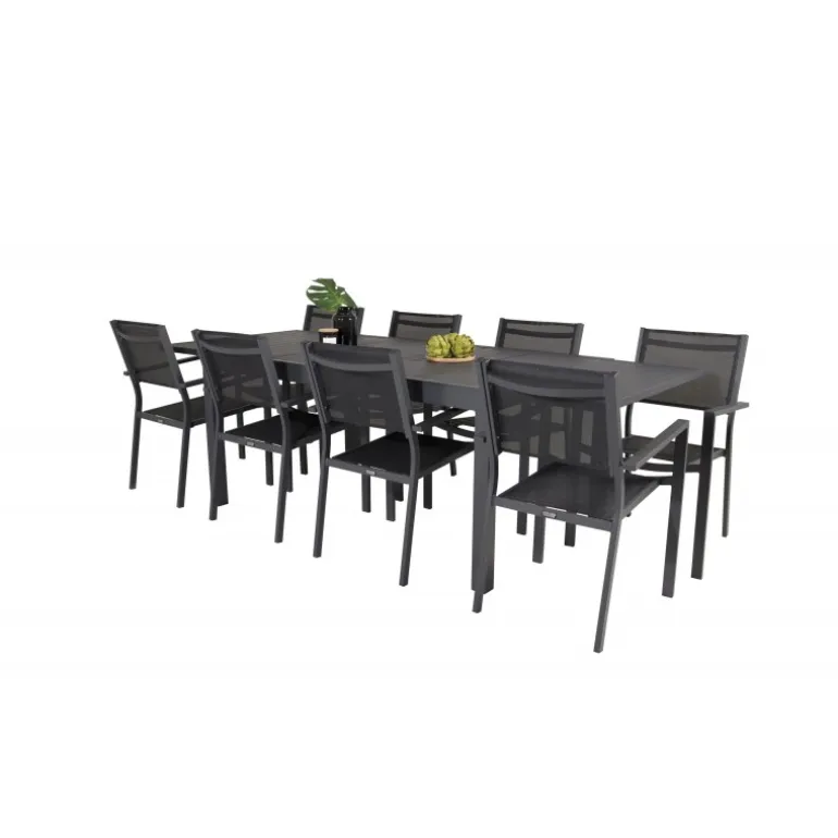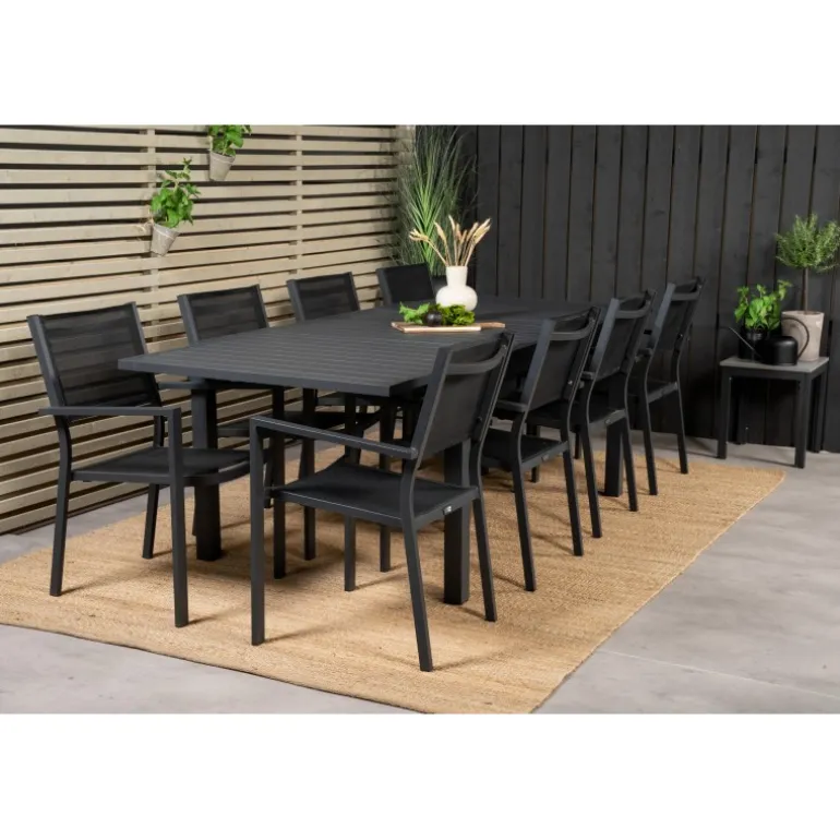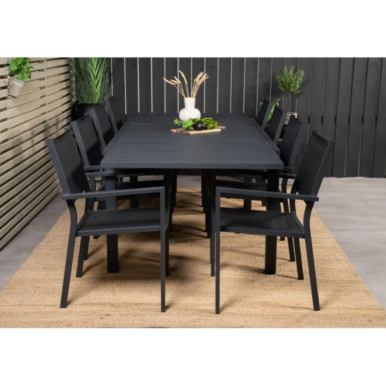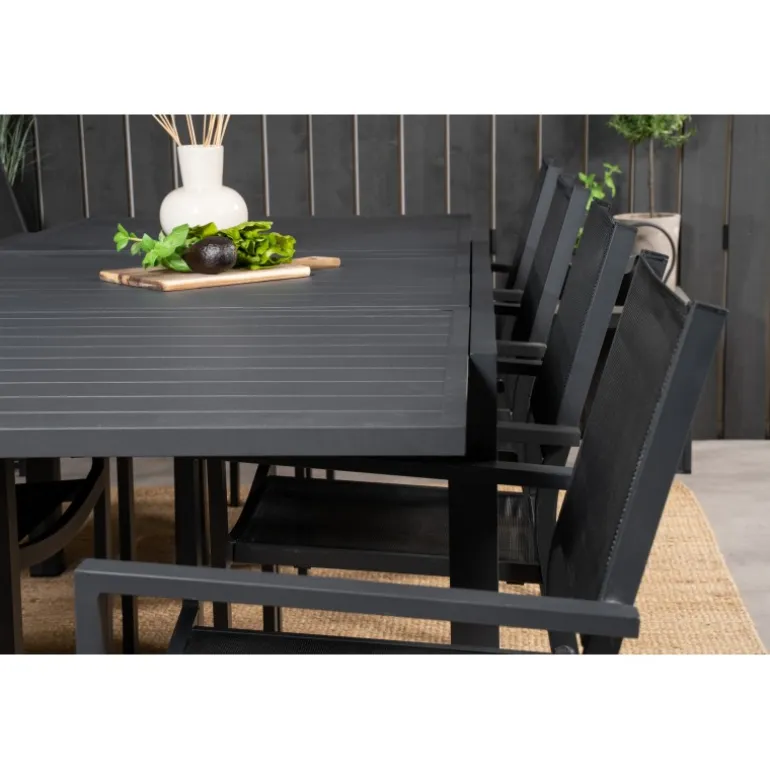 Marbella Loungesæt – Havemøbelsæt med Copacabana stole er den perfekte tilføjelse til enhver terrasse eller have. Bordet er udtrækkeligt, hvilket giver mulighed for større middagsselskaber! Dette elegante sæt i sort aluminium og textilene er både stilfuldt og holdbart. Skab uforglemmelige øjeblikke med venner og familie omkring dette smukke Loungesæt – Havemøbelsæt.
