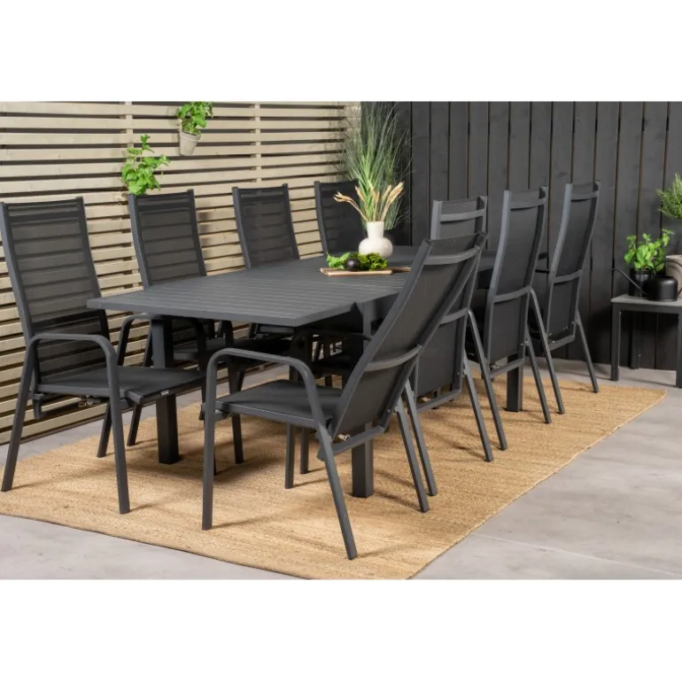 - Holdbart materiale: Fremstillet af aluminium og tekstilene, som er lette og rustfri, hvilket gør sættet ideelt til udendørs brug.