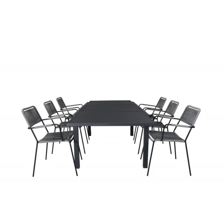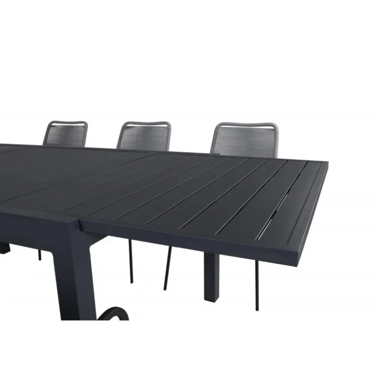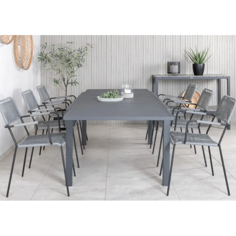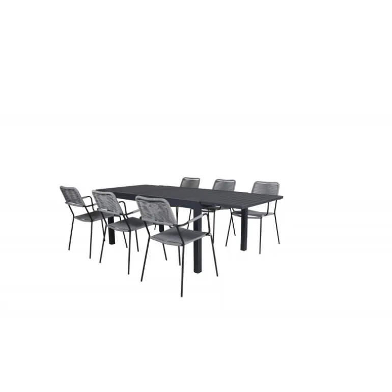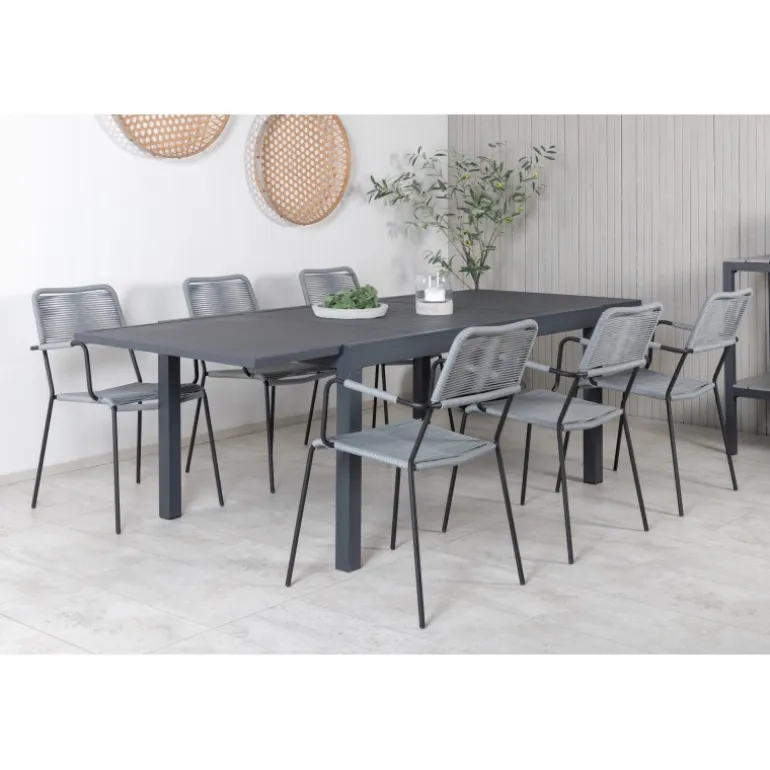 Klassisk madgruppe, der passer ind i de fleste husholdninger! Spisebordet Marbella sammen med stole i serien Lindos skaber en hyggelig og moderne atmosfære i udendørsområdet eller på terrassen. Bordet er udtrækkeligt, hvilket gør det ideelt til både små og store sammenkomster. Fremstillet af aluminium og polyester reb, dette sæt er både let og holdbart. Sort og grå farver giver et stilrent look.