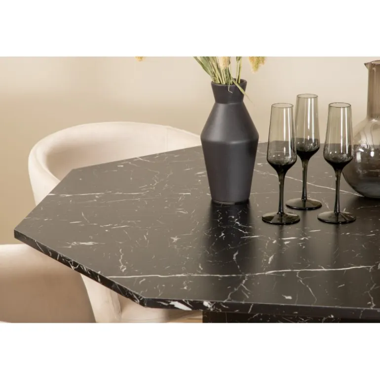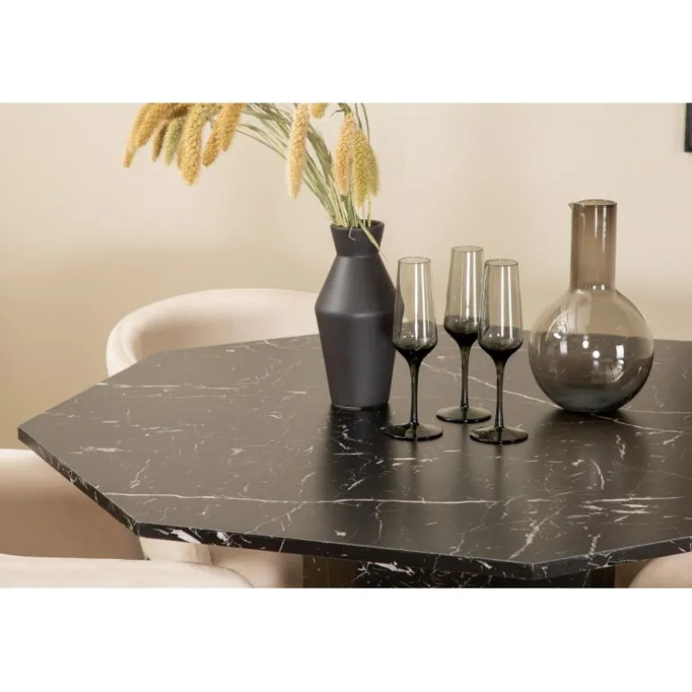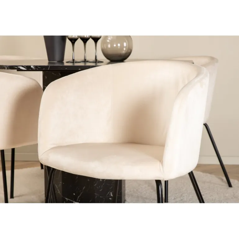 Sid komfortabelt i vores lækre spisebordsstole fra Berit-serien og nyd lange måltider sammen! Stolene har et slankt design med en indbydende sæde i beige fløjl og stoleben i sort jern. Stolens dimensioner: Højde: 78 cm, sædehøjde: 49 cm, bredde: 55 cm, dybde: 55 cm. De 4 stole matches her med vores populære spisebord Marbs. Bordet er formet som en ottekant og har et fuldt beklædt design med en bordplade i sort marmorglas med hvidt mønster og bordben i MDF og marmorpapir. Bordets dimensioner: Diameter: 110 cm, højde: 75 cm.