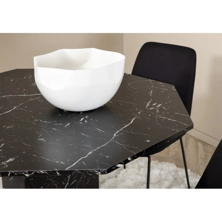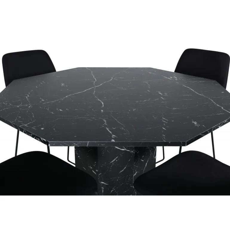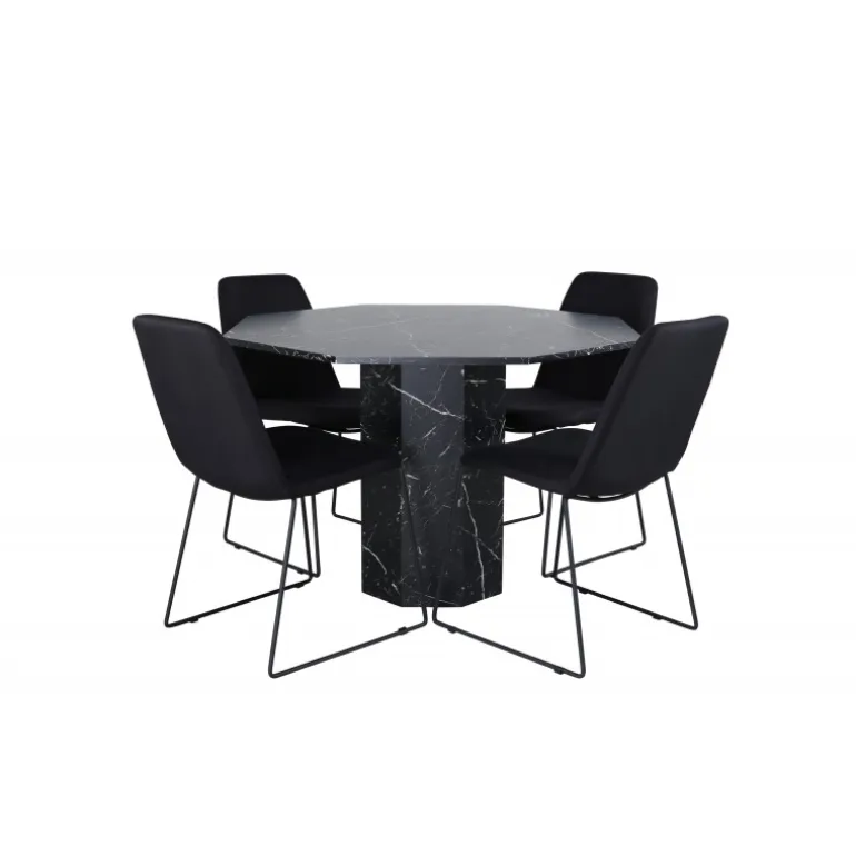 Øg niveauet af indretning med et moderne spisebordssæt i elegant design! Spisebordet Marbs er formet som en ottekant og har et fuldt beklædt design med en bordplade i sort marmorglas med plettet hvidt mønster og bordben i MDF og marmorfolie. Bordets diameter: 110 cm, højde: 75 cm. Matchet med 4 Muce spisebordsstole i stilfuldt design. Stolens ben er slanke i metal, og sæderne er i sort polyesterstof. Stolens dimensioner: højde: 84 cm, sædehøjde: 47 cm, bredde: 43 cm, dybde: 63 cm. Indret stuen med et moderne spisebordssæt, der skaber en familiær stemning!