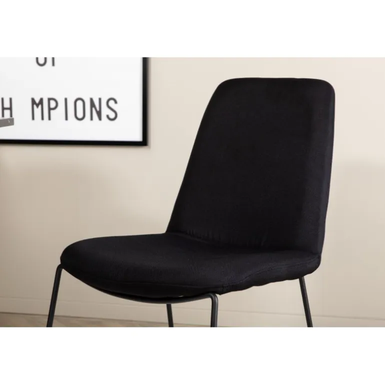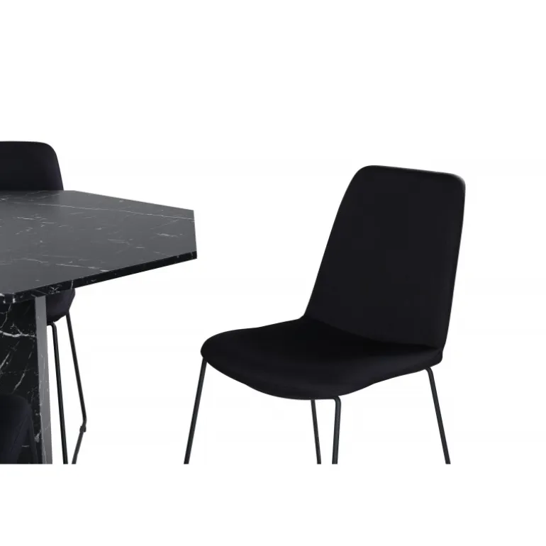 - Matchende Stole: Inkluderer 4 Muce spisebordsstole med slanke metalben og sort polyesterstof.