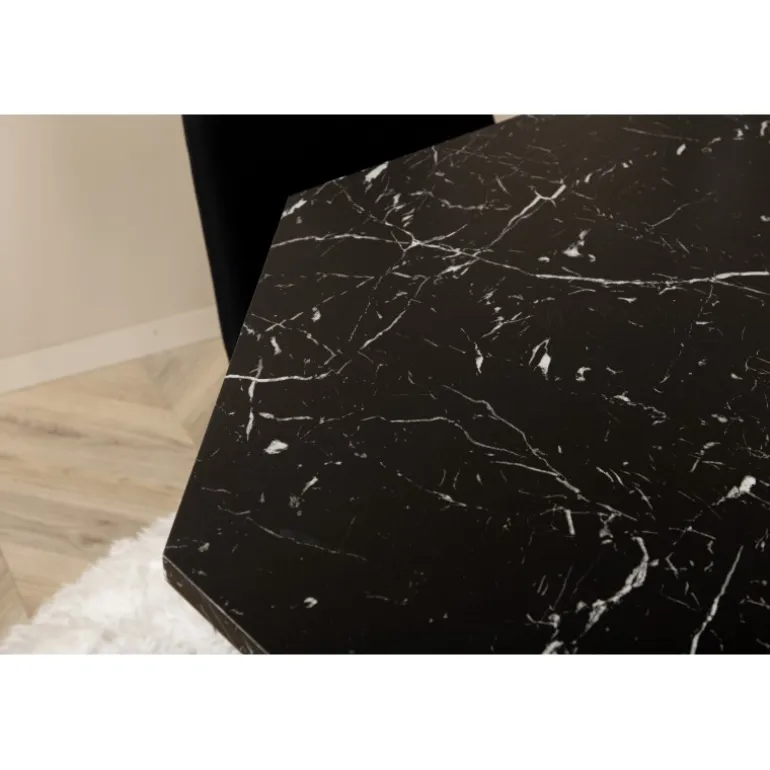 - Moderne Design: Stilfuldt ottekantet bord med sort marmorglas og hvidt mønster.