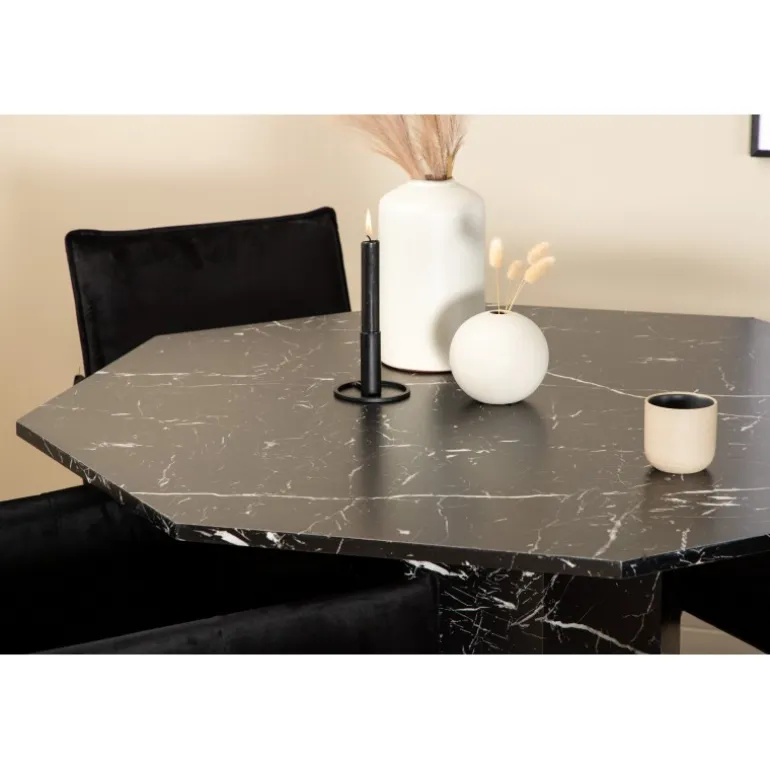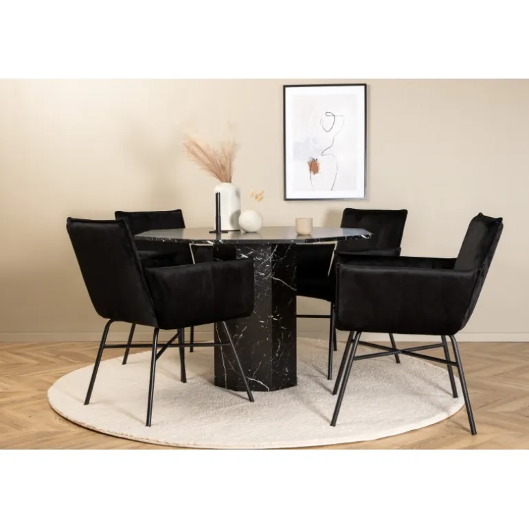 Skab et blikfang, der imponerer! Spisestolene Petra har et lækkert design med lige nordiske former, blødt velourstof i sort farve og stoleben i sort jern. Stolens dimensioner: Højde: 87 cm, sædehøjde: 48 cm, bredde: 57 cm, dybde: 60 cm. Her er de 4 stole kombineret med spisebordet Marbs – et designbord med lækkert design. Bordet er formet som en oktagon og har et fuldt beklædt design med en topplade i sort marmorglas med spættet hvidt mønster og bordben i MDF og marmor papir. Bordets dimensioner: Diameter: 110 cm, højde: 75 cm.