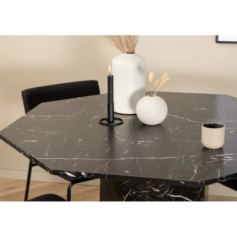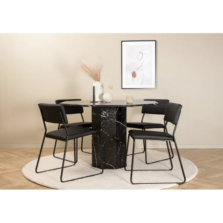 Inviterende og stilfuldt – Marbs Rundt Spisebordssæt skaber et modebevidst indtryk i dit hjem! Bordet er formet som en ottekant og har et fuldt beklædt design med en topplade i sort marmorglas med hvidt stænkmønster og bordben i MDF og marmorpapir. Bordets diameter: 110 cm, højde: 75 cm. Matcher her med 4 Kenth spisebordsstole i sort farve med stoleben i jern og sæder i kunstlæder. Stolens dimensioner: Højde: 76 cm, sædehøjde: 48,5 cm, bredde: 40 cm, dybde: 52 cm. Lad hjemmets hjerte pryde af denne iøjnefaldende Spisebordssæt!
