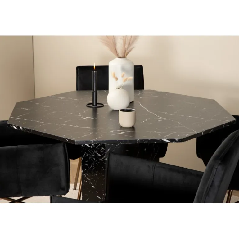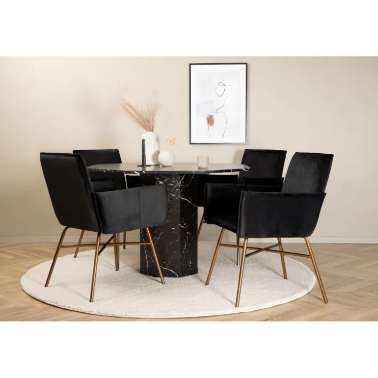 Skab en opsigtsvækkende spiseoplevelse med Marbs Rundt Spisebordssæt! Spisestolene Petra har et lækkert design med lige nordiske linjer, blødt velourstof i sort farve og stoleben i kobberfarvet jern. Stolemål: Højde: 87 cm, sædehøjde: 48 cm, bredde: 57 cm, dybde: 60 cm. Her kombineres de 4 stole med spisebordet Marbs – et designbord med et lækkert design. Bordet er formet som en ottekant og har en fuldt beklædt design med en bordplade i sort marmorglas med hvidt mønster og en bordben i MDF og marmorpapir. Bordmål: Diameter: 110 cm, højde: 75 cm.