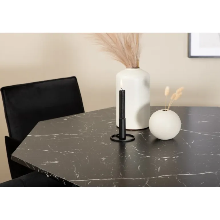 - Unikt borddesign: Ottekantet bord med sort marmorglasplade og hvidt mønster.