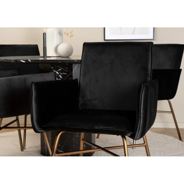 - Flerfarvet finish: Sort og kobberfarvede stole, sort bord – et stilfuldt match.