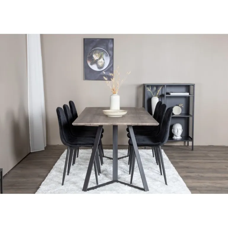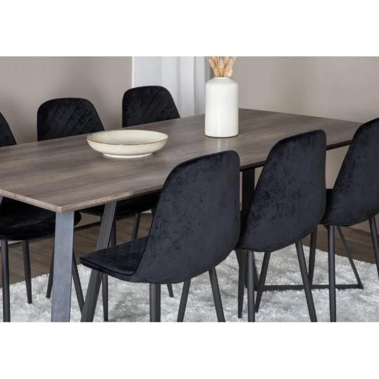 Vores elegante sorte fløjlsstole i Polar-serien. Her i en stilfuld kombination med vores populære spisebord Marina. Perfekt kombination til hjemmets hjerte, som sandsynligvis vil passe lige så godt til dine behov som til din øvrige indretning. Lavet af MDF, krydsfiner og stål, garanterer dette Spisebordssæt både holdbarhed og et moderne udtryk.