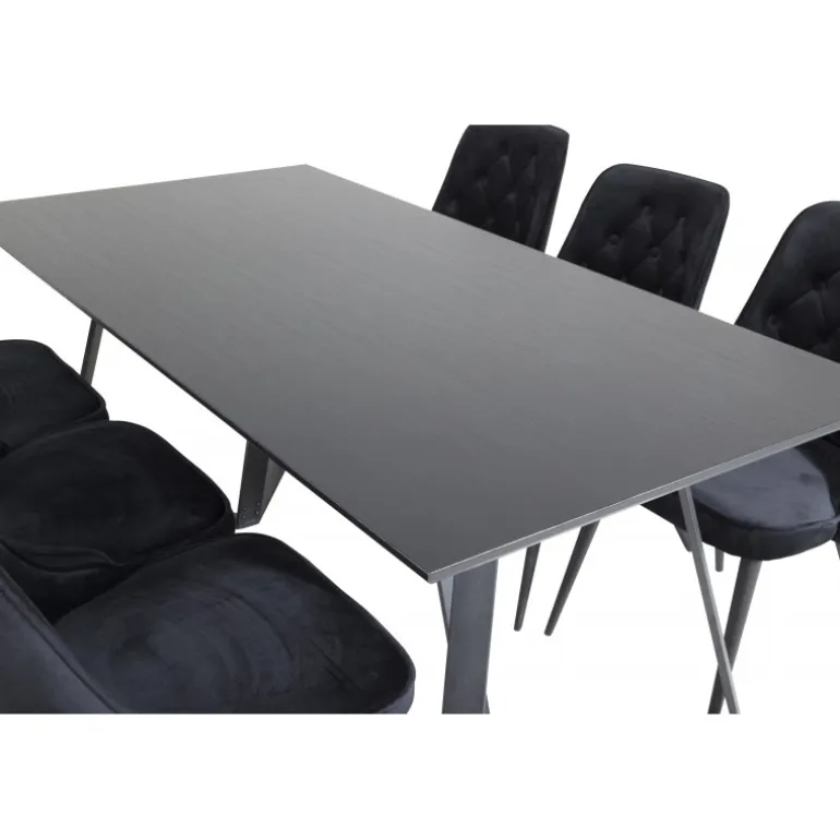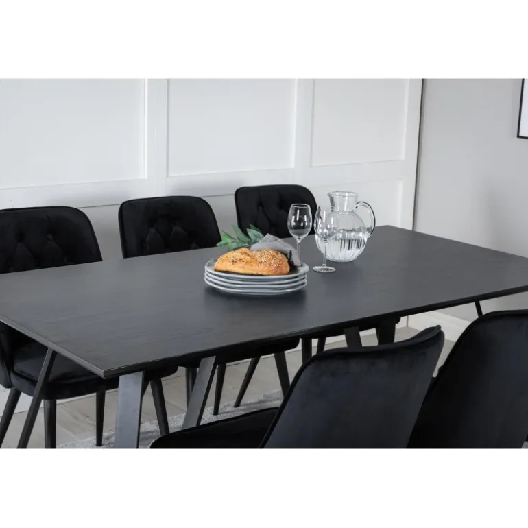 At købe en færdigsammensat Spisebordssæt er både trendsikkert og praktisk! Her kombinerer vi vores spisebord Marina med vores luksuriøse spisebordsstole Velvet. Lad hjertet i hjemmet blive præget af din nye iøjnefaldende Spisebordssæt. Sort farve og materialer af MDF, krydsfiner og stål sikrer holdbarhed og stil.