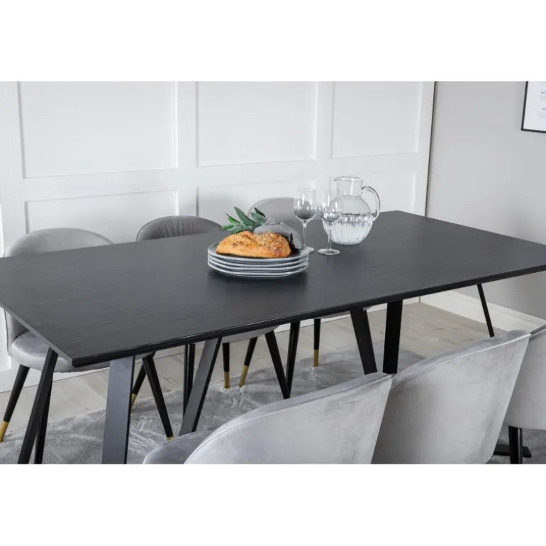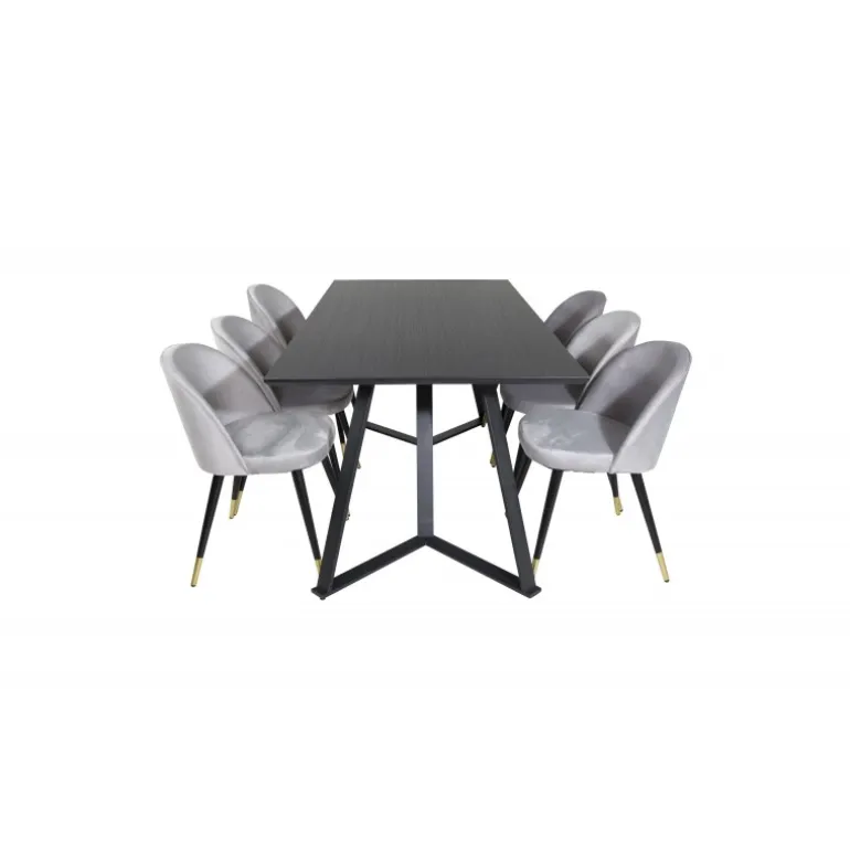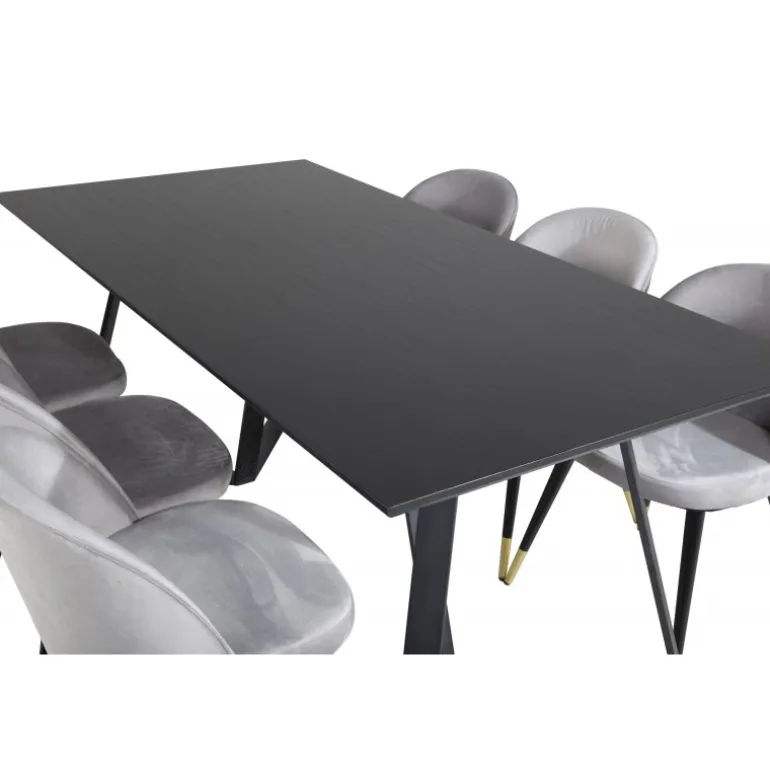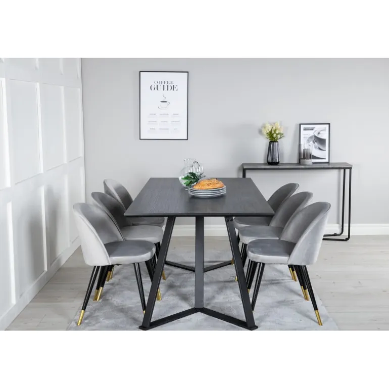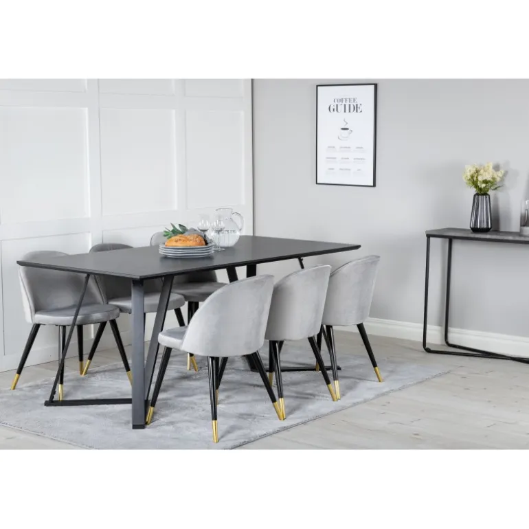 Køb af et præ-komponeret Spisebordssæt er både trendsikkert og praktisk! Her kombinerer vi vores spisebord Marina med vores luksuriøse Velvet spisebordsstole. Lad hjemmets hjerte præges af din nye iøjnefaldende Spisebordssæt. Marina Rektangulært Spisebordssæt tilbyder både elegance og komfort til din spisestue. Med en sort MDF bordplade og stole i bøjet træ, skum og stål, er dette sæt designet til at imponere og holde.