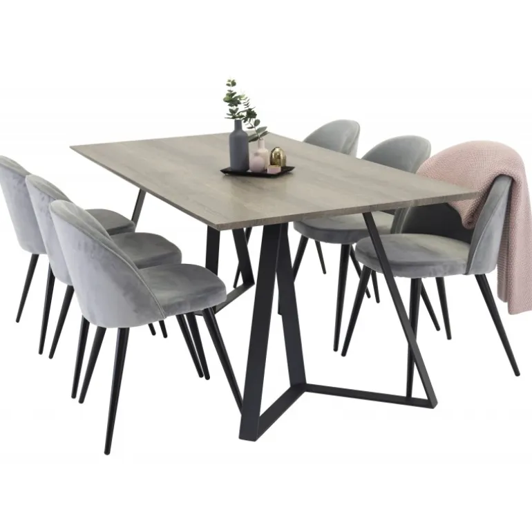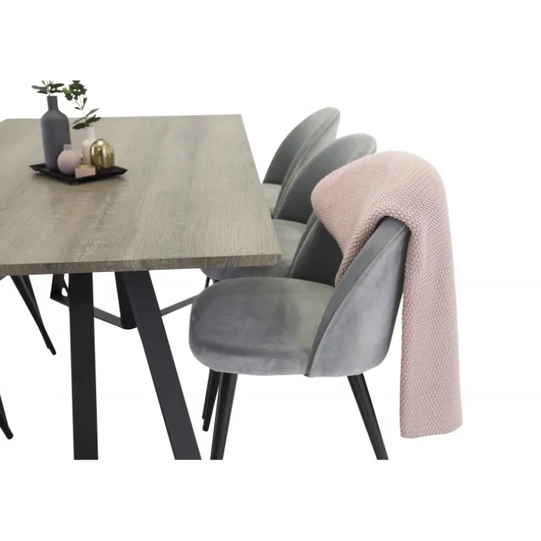 Spisebordet Marina i en dejlig træfinish kombineret med bløde, lysegrå fløjlstole fra serien Velvet. Et rustikt og hyggeligt valg, der passer ind i de fleste hjem! Dette sæt tilbyder både stil og komfort, hvilket gør det perfekt til familiemiddage eller sociale sammenkomster. Marina Rektangulært Spisebordssæt er designet til at bringe en varm og indbydende atmosfære til dit spisestue.