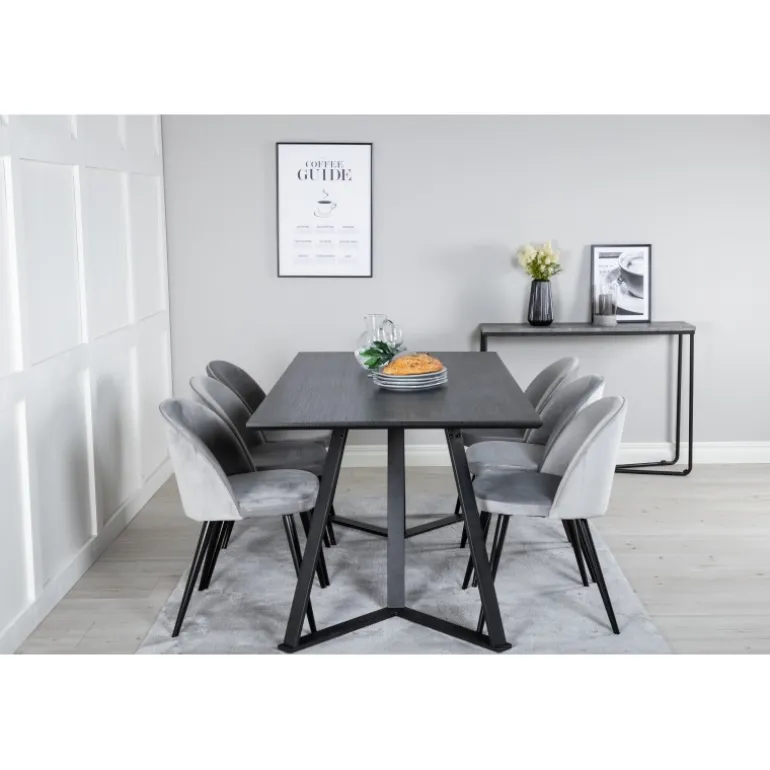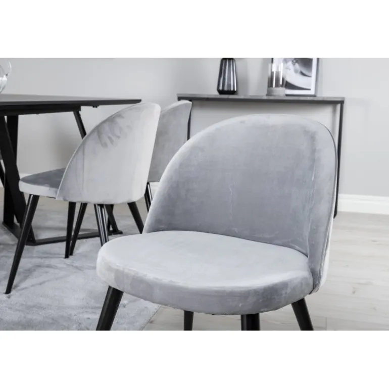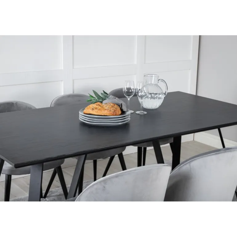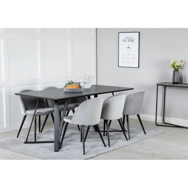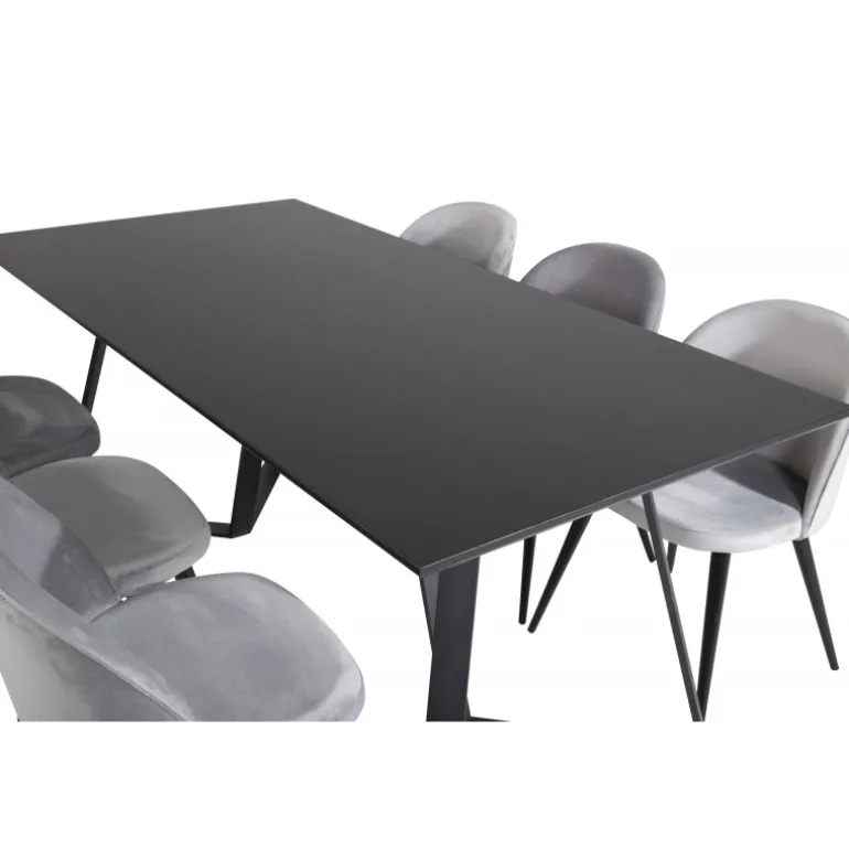 Køb af et færdigsammensat Spisebordssæt er både trendsikkert og praktisk! Her kombinerer vi vores spisebord Marina med vores luksuriøse spisestole Velvet. Lad hjertet af dit hjem blive præget af dit nye iøjnefaldende Spisebordssæt. Det elegante sorte bord i MDF og grå stole i bøjtræ og stål skaber en stilfuld kontrast, der passer til ethvert interiør.