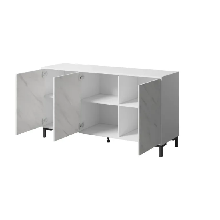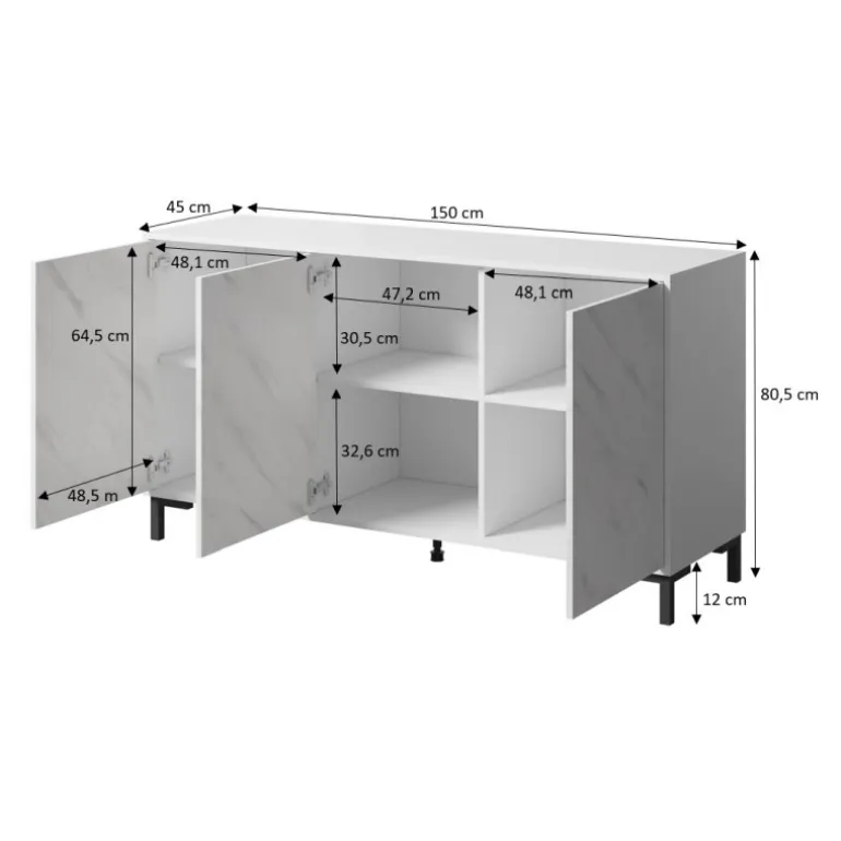 MARMO KOM 150/3D hvid er den perfekte tilføjelse til ethvert moderne hjem. Med sine dimensioner på 80,5cm i højden, 150cm i bredden og 45cm i dybden, tilbyder denne kommode rigelig opbevaringsplads uden at dominere rummet. Fremstillet af lamineret spånplade med en imponerende marmorimitation finish, kombinerer den stil og funktionalitet. ABS-kanter sikrer holdbarhed, mens plastben og det innovative PUSH-CLICK håndtagssystem gør det nemt og bekvemt at åbne og lukke skufferne. MARMO KOM 150/3D leveres i to kasser med en samlet nettovægt på 49 kg og en bruttovægt på 50 kg.
