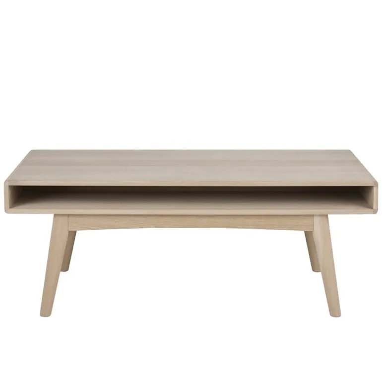 Stilrent sofabord i egetræ i tidløst og funktionelt design med opbevaringsrum under bordpladen. De skrå ben er lavet af massivt egetræ, hvilket sikrer god stabilitet og lang holdbarhed. Bordet er overfladebehandlet med hvidpigmenteret olie, som fremhæver det naturlig look og giver møblet en lys og lækker finish.
