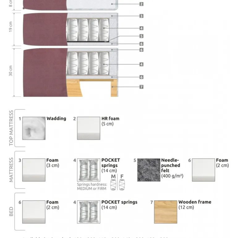 - Pocketfjedre (14 cm): Bidrager til en mere fleksibel og støttende opbygning.