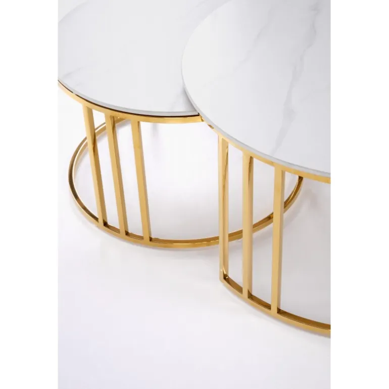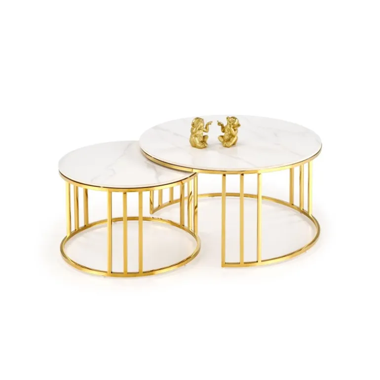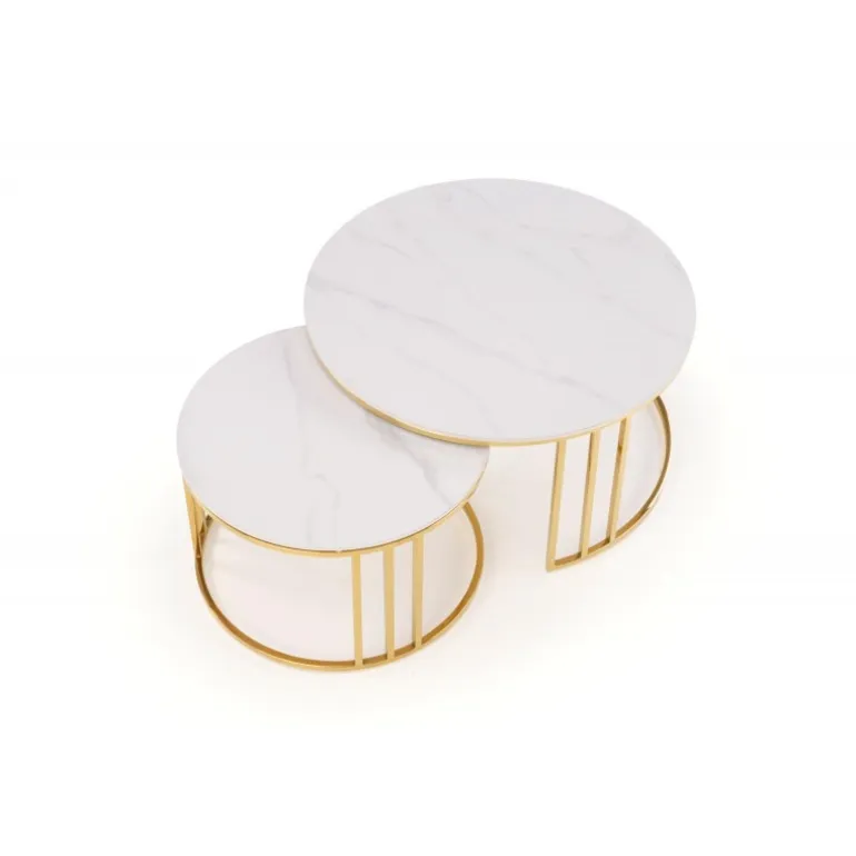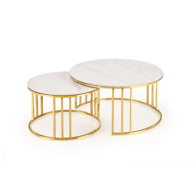 Oplev elegance og funktionalitet med MERCURY 3 sæt af 2 sofaborde i hvid marmor og guld. Disse borde er fremstillet af sinteret sten og rustfrit stål, hvilket sikrer både holdbarhed og stil. Med dimensionerne 80/42 cm og 60/38 cm passer de perfekt ind i enhver moderne stue. Det smukke hvid marmor look kombineret med det gyldne stel giver en luksuriøs følelse til dit hjem. Køb dette sæt og tilføj et strejf af sofistikeret stil til dit interiør.