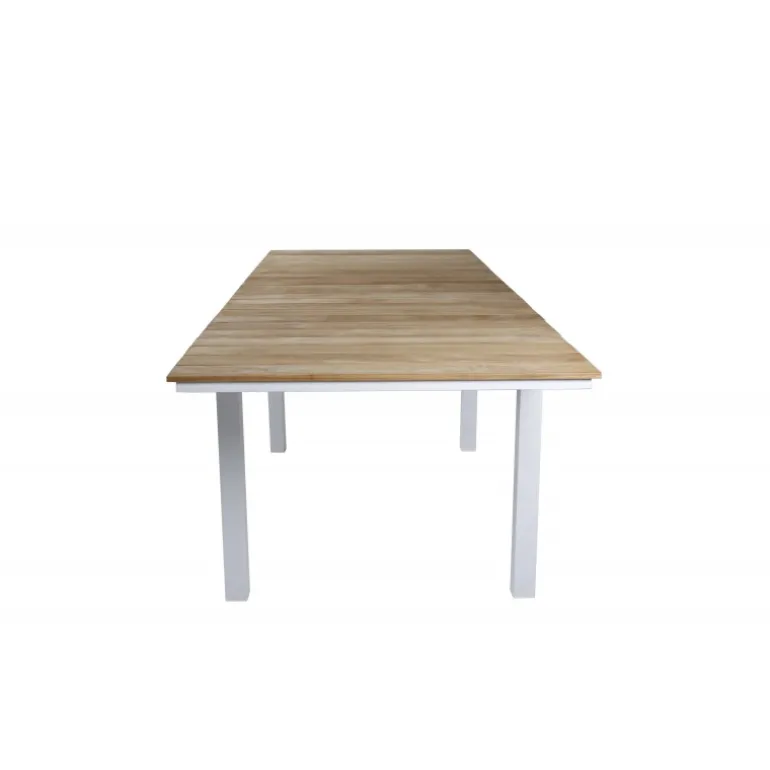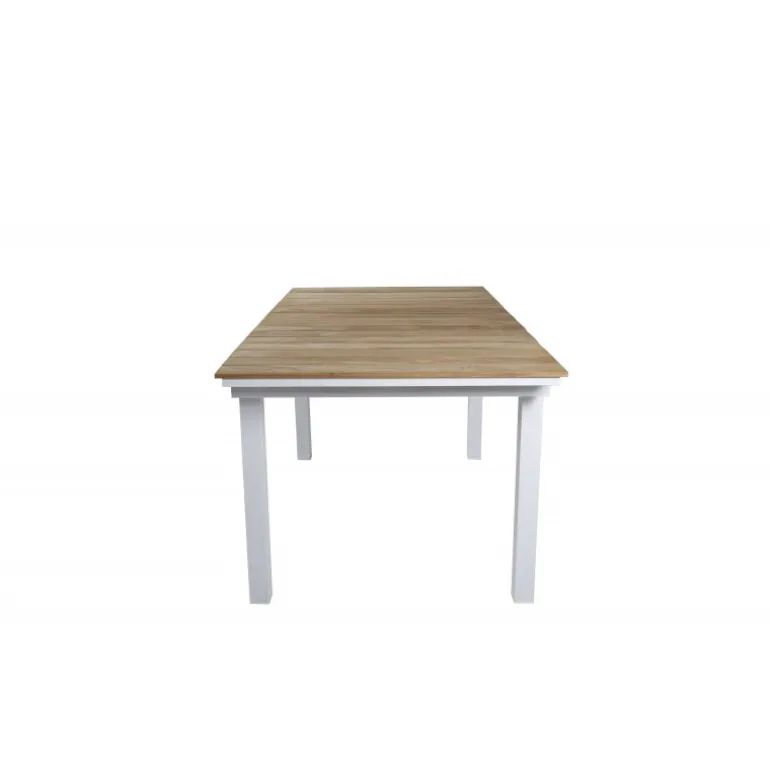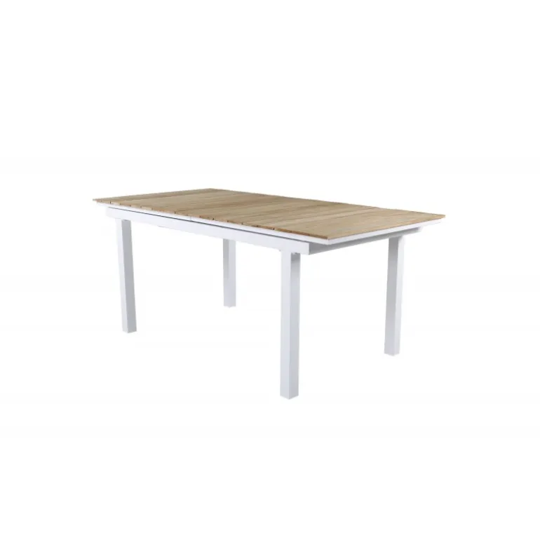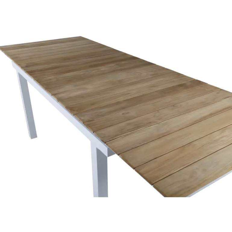 Mexico – Et udtrækkeligt spisebord, der skaber succes både til hverdag og fest! Dette lækre, rektangulære spisebord har en moderne teakbordplade og en hvid metalunderstel. Det gennemgående design er lige så stilfuldt som holdbart, så her får du et bord, der vil stå over tid! Følg vores vedligeholdelsesråd for den bedste holdbarhed.
